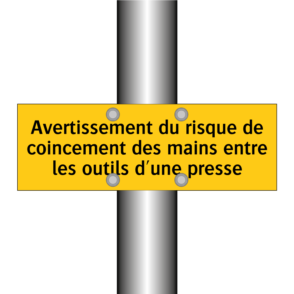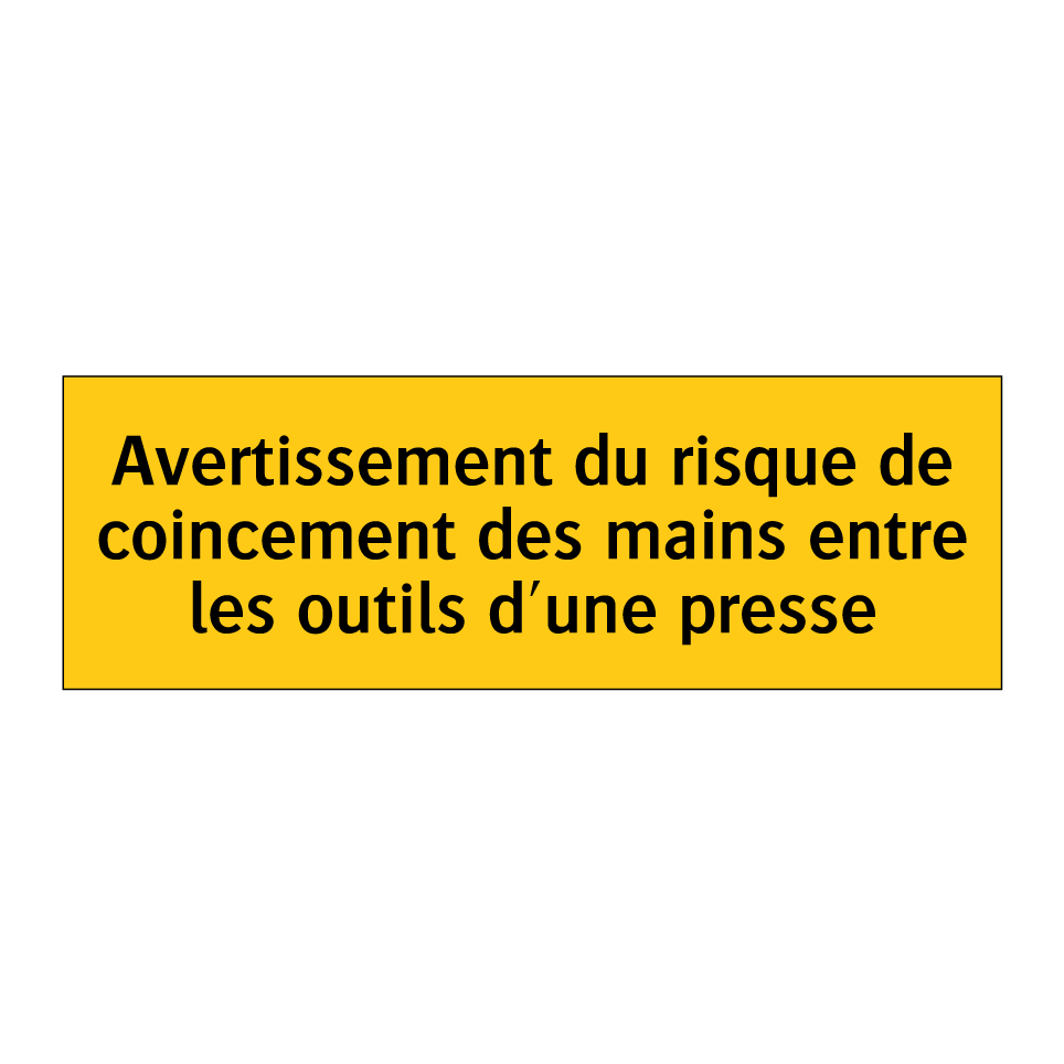 Panneau d'avertissement avec le texte : "Avertissement du risque de coincement des mains entre les outils d'une presse"