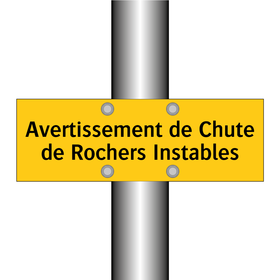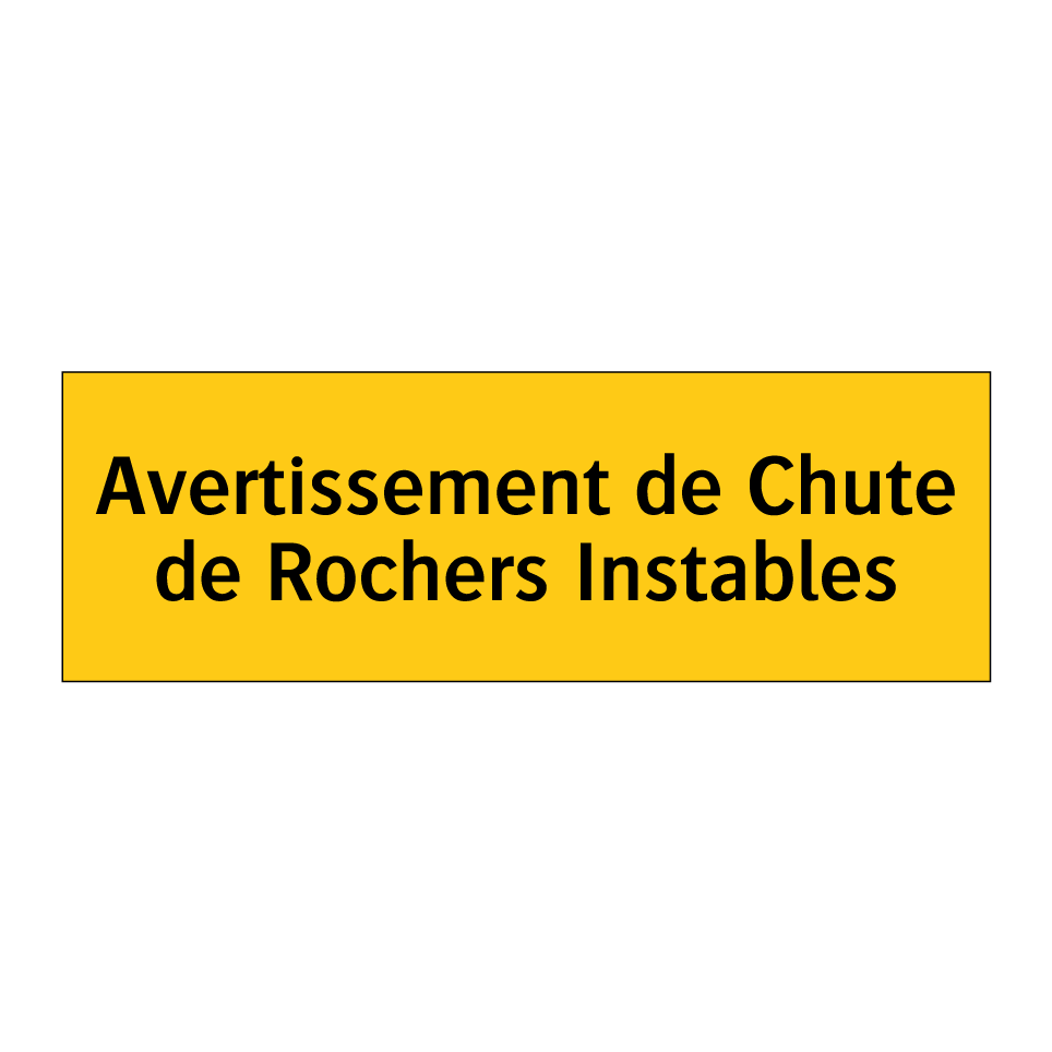 Panneau d'avertissement avec le texte : "Avertissement de Chute de Rochers Instables"