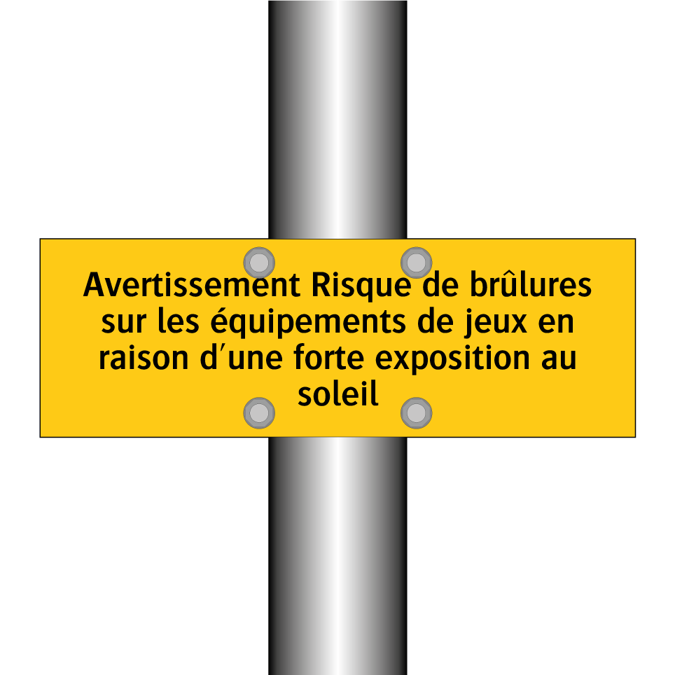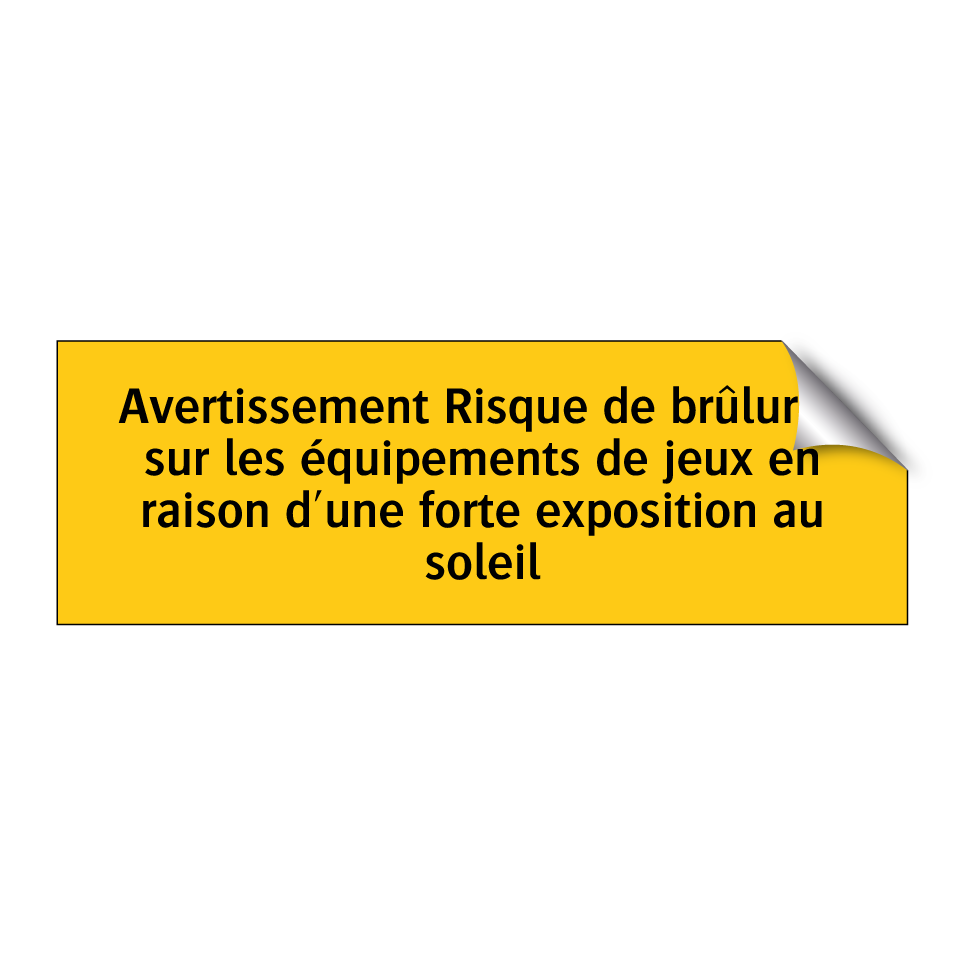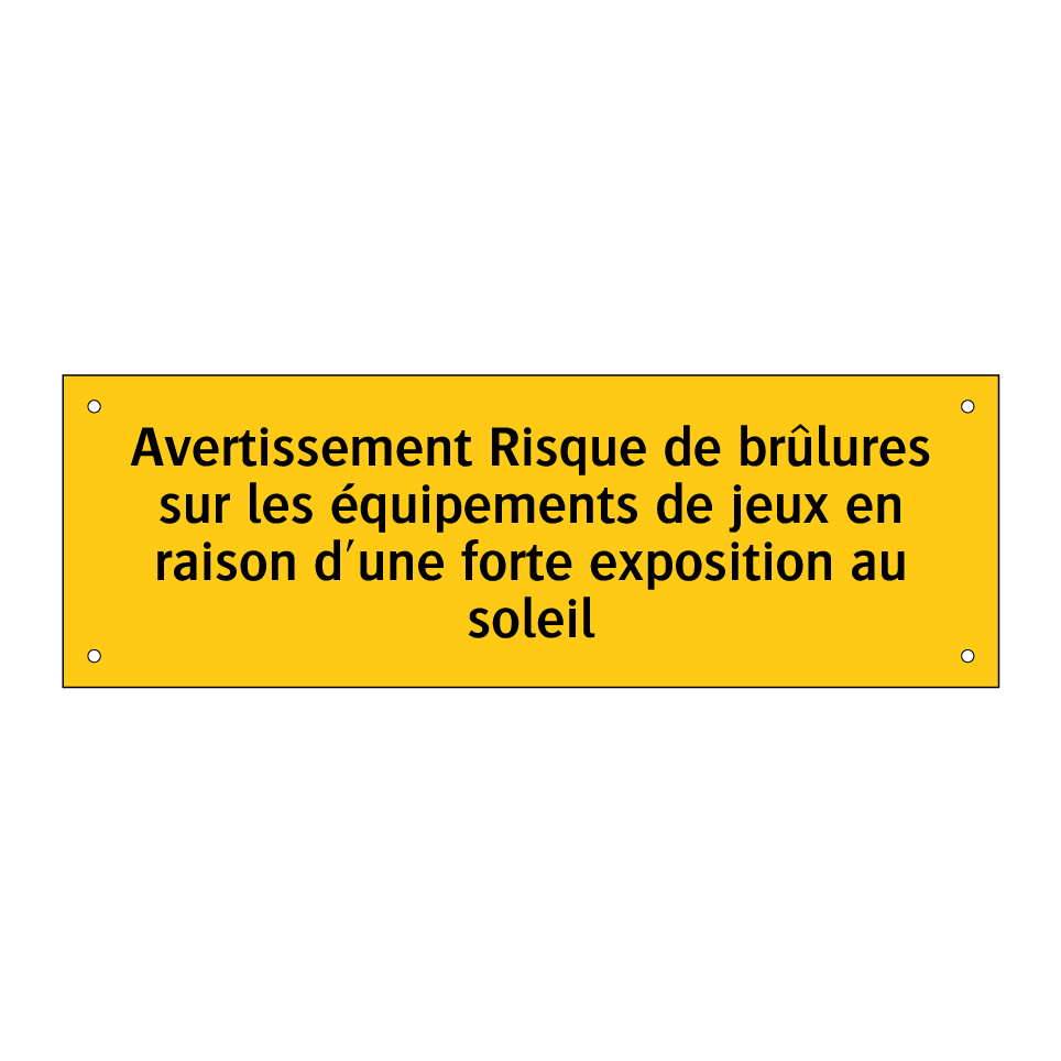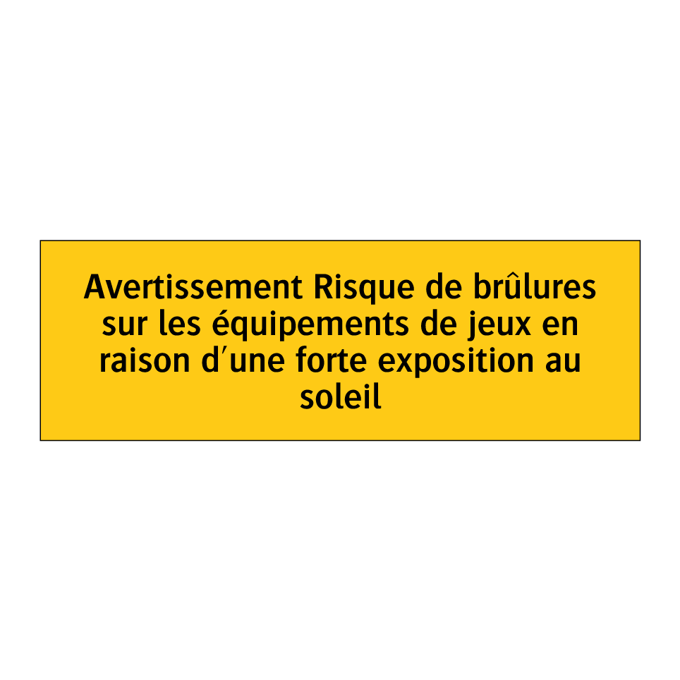 Panneau d'avertissement avec le texte : "Avertissement Risque de brûlures sur les équipements de jeux en raison d'une forte exposition au soleil"