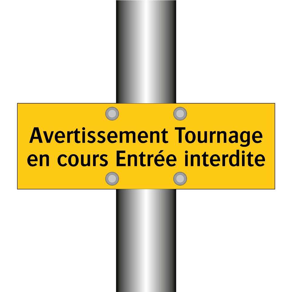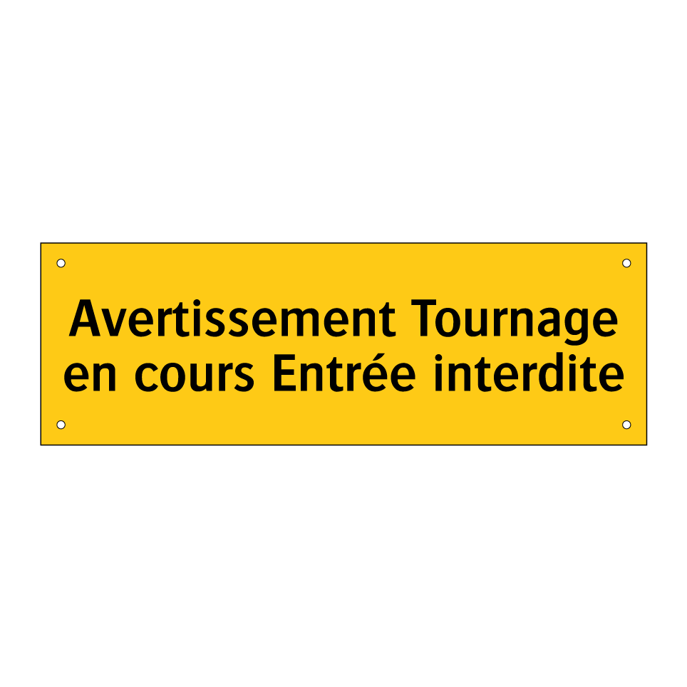Panneau d'avertissement avec le texte : "Avertissement Tournage en cours Entrée interdite"
