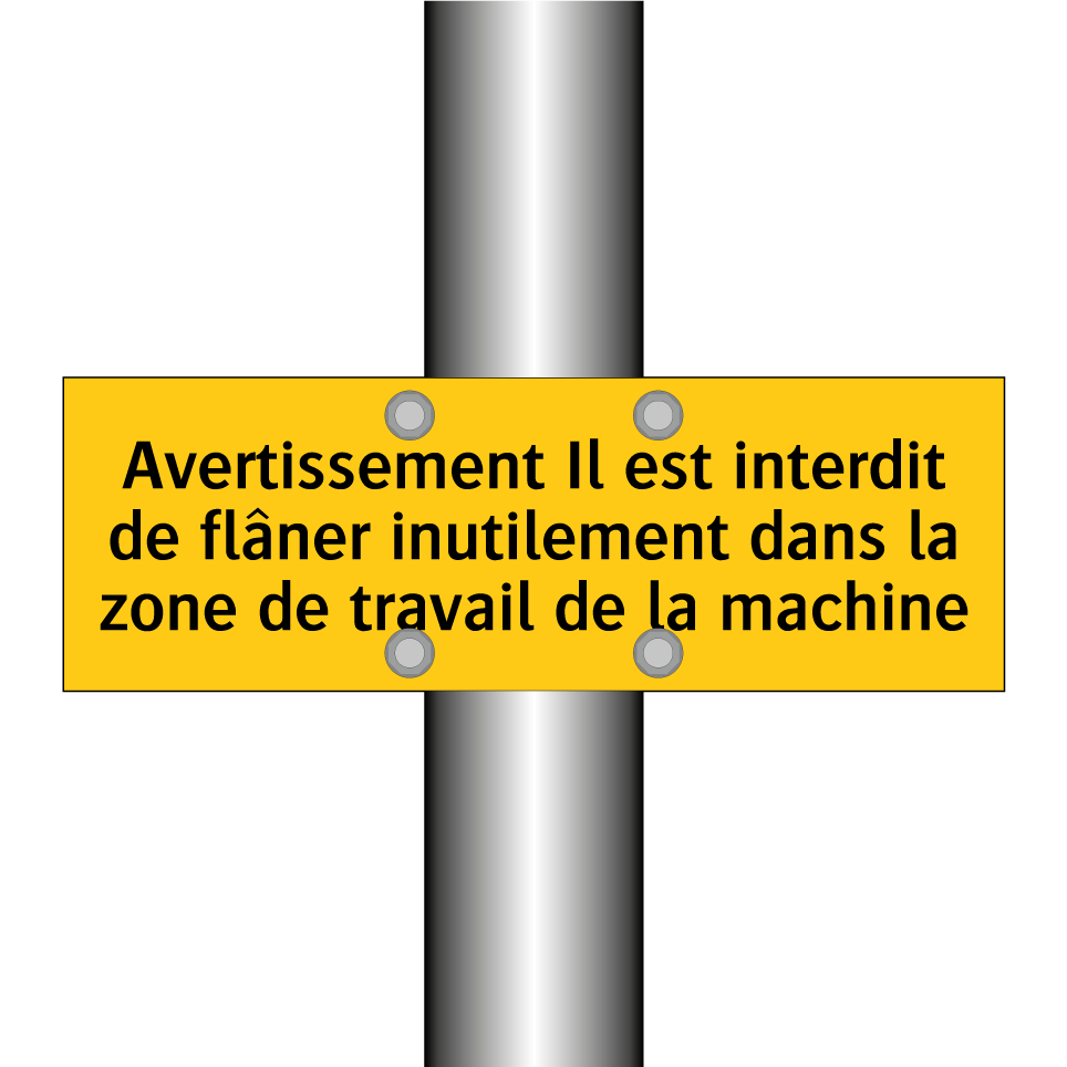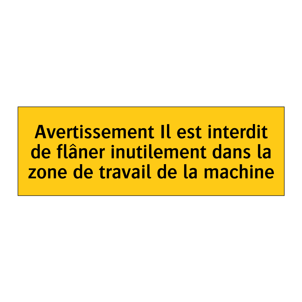 Panneau d'avertissement avec le texte : "Avertissement Il est interdit de flâner inutilement dans la zone de travail de la machine"