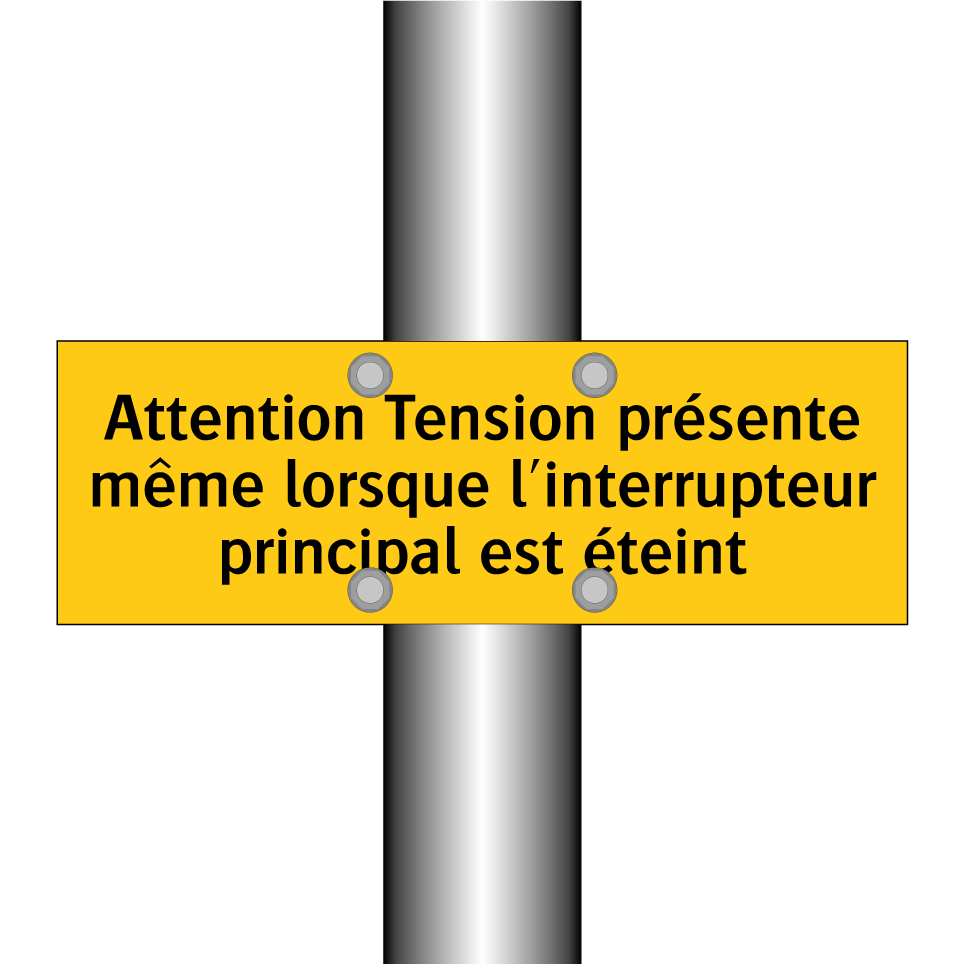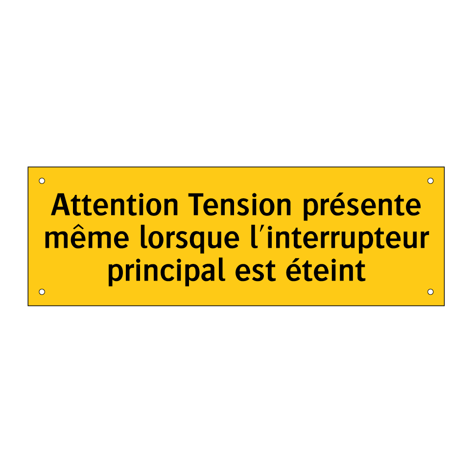 Panneau d'avertissement avec le texte : "Attention Tension présente même lorsque l'interrupteur principal est éteint"
