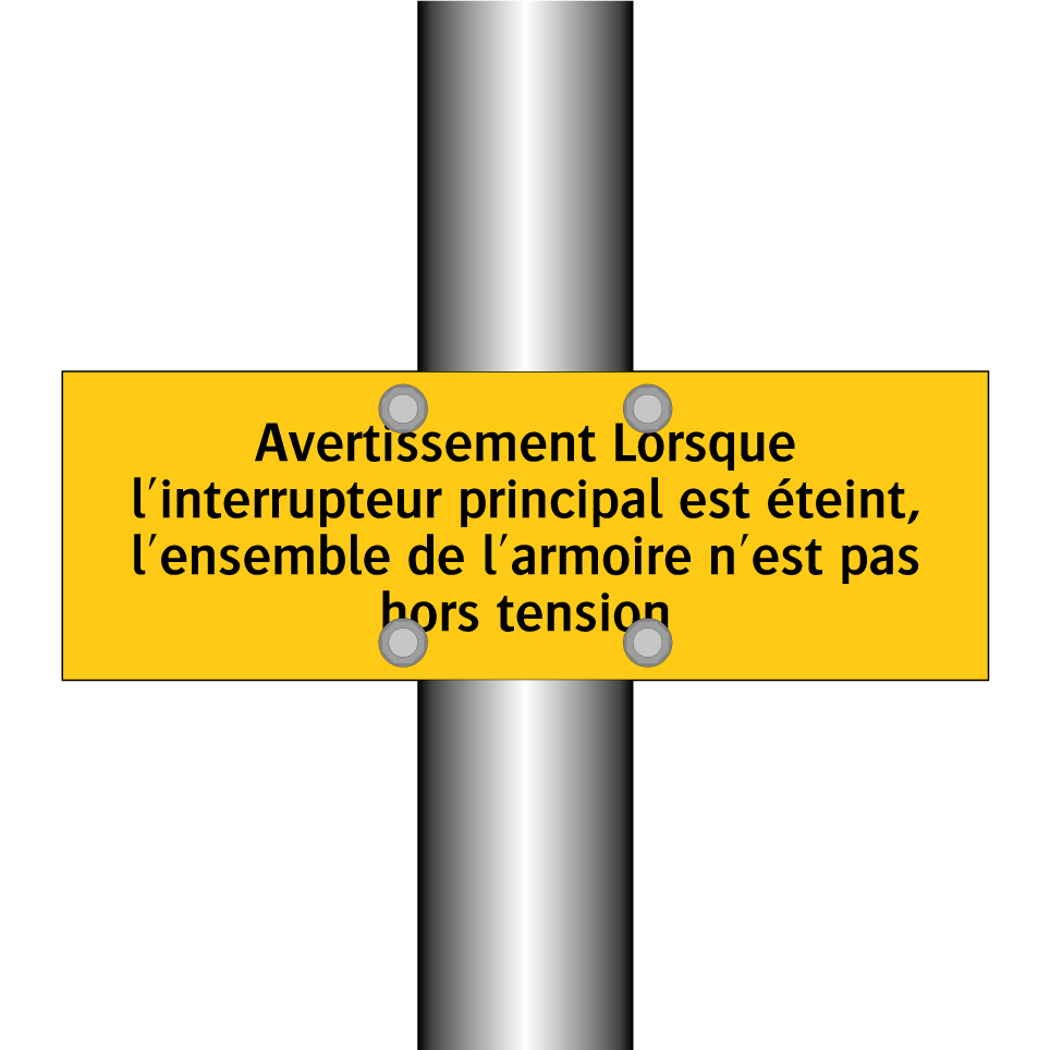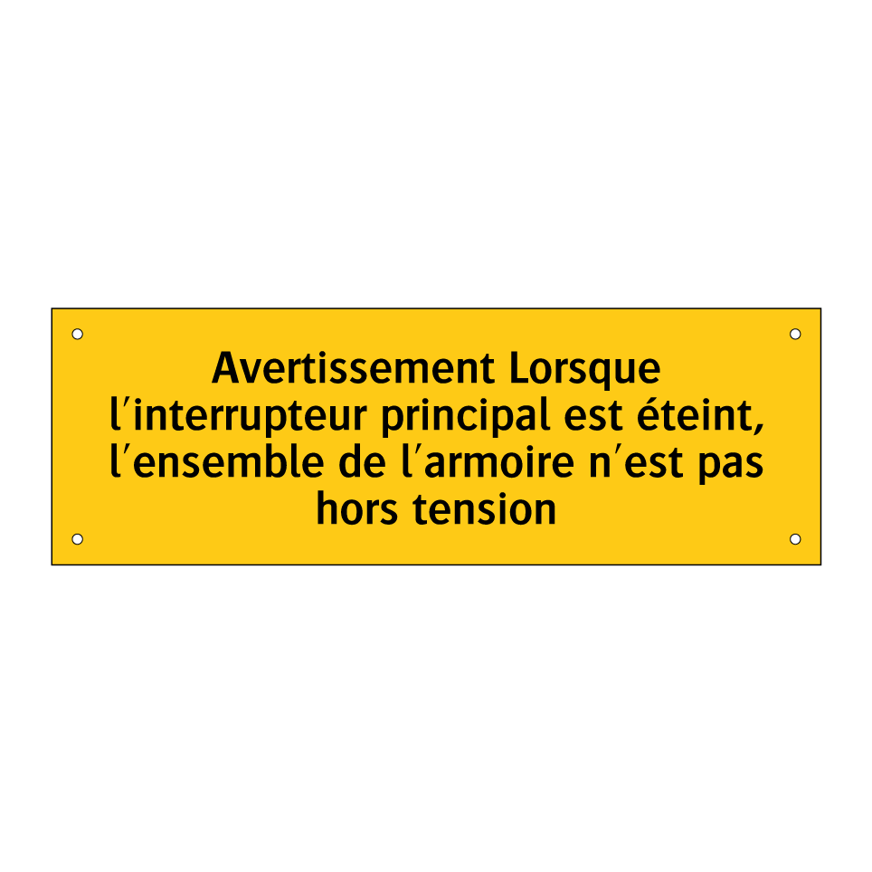 Panneau d'avertissement avec le texte : "Avertissement Lorsque l'interrupteur principal est éteint, l'ensemble de l'armoire n'est pas hors tension"