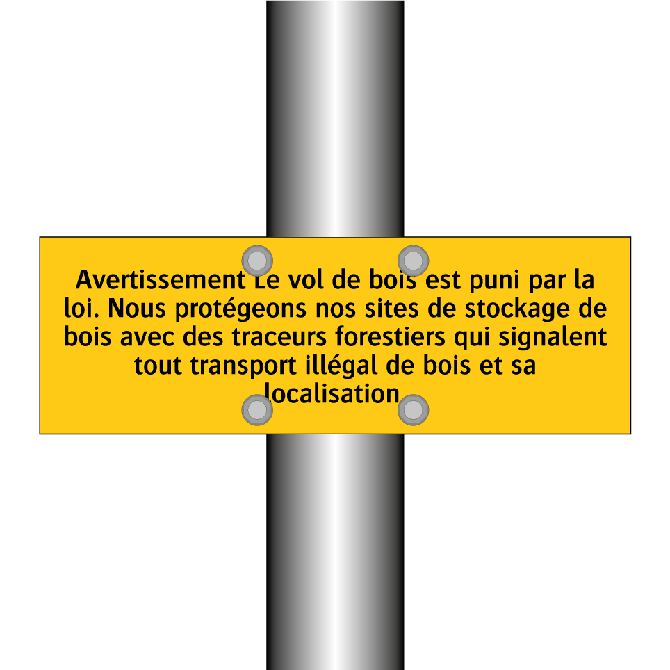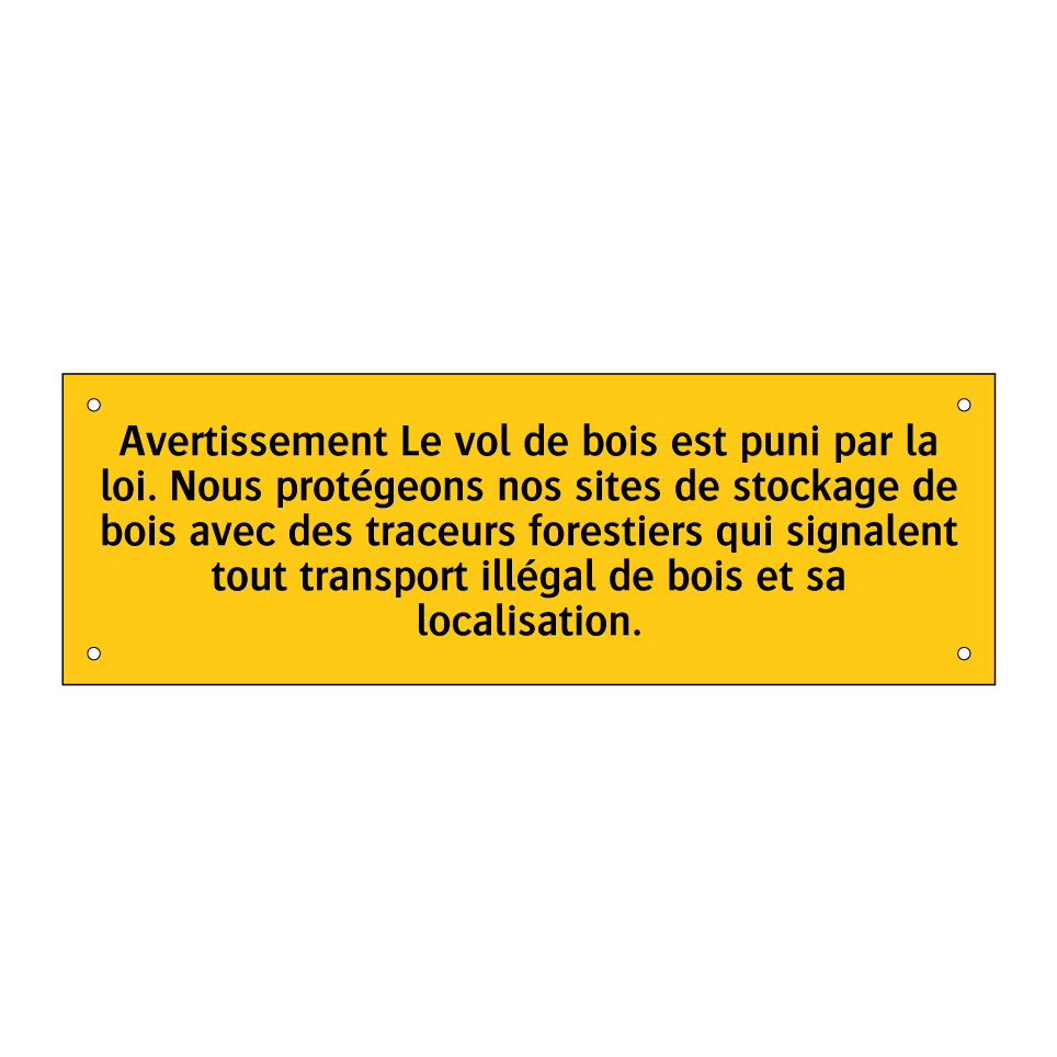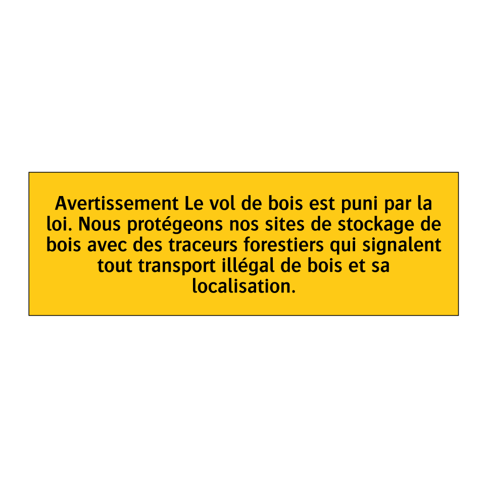 Panneau d'avertissement avec le texte : "Avertissement Le vol de bois est puni par la loi. Nous protégeons nos sites de stockage de bois avec des traceurs forestiers qui signalent tout transport illégal de bois et sa localisation"