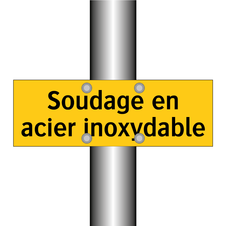Panneau d'avertissement avec le texte : "Soudage en acier inoxydable"
