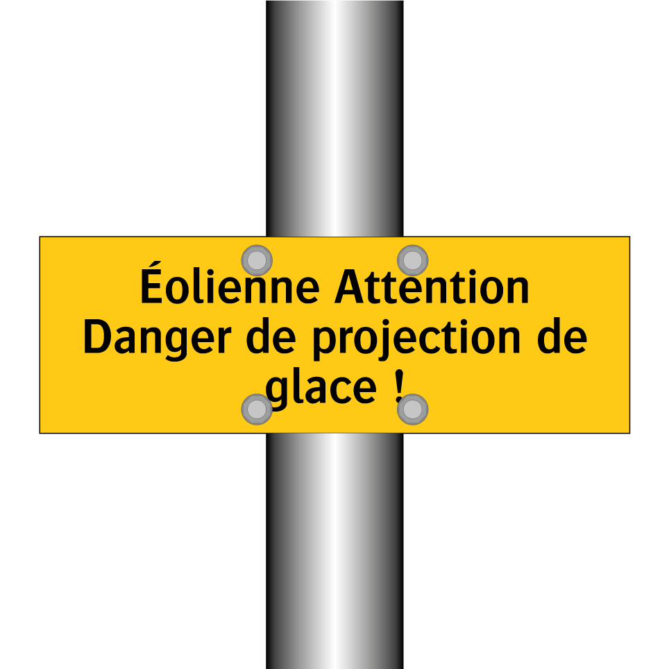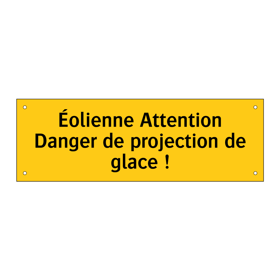 Panneau d'avertissement avec le texte : "Éolienne Attention Danger de projection de glace !"