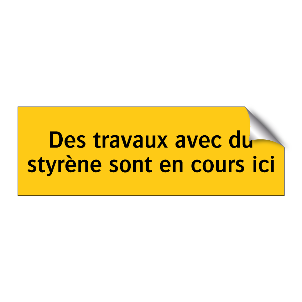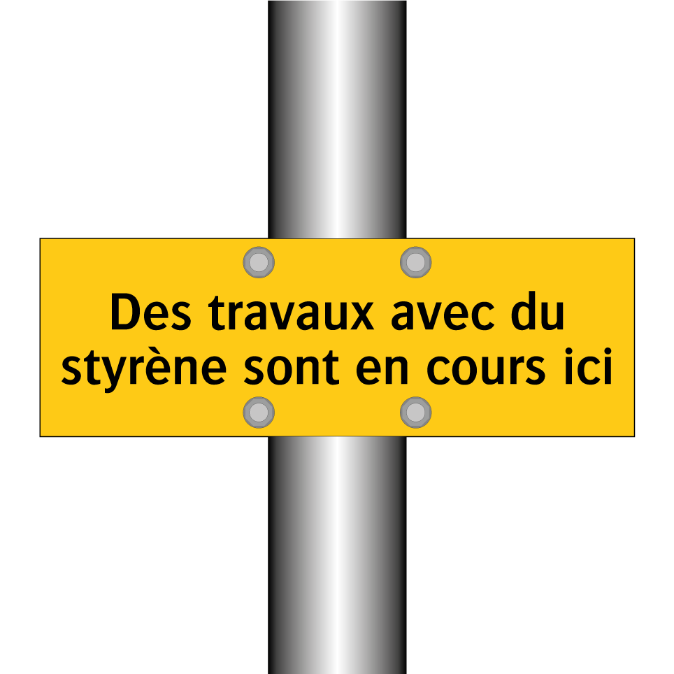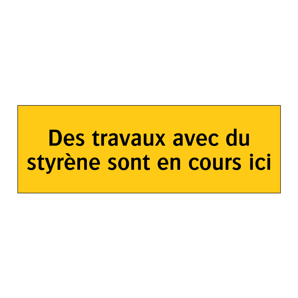 Panneau d'avertissement avec le texte : "Des travaux avec du styrène sont en cours ici"