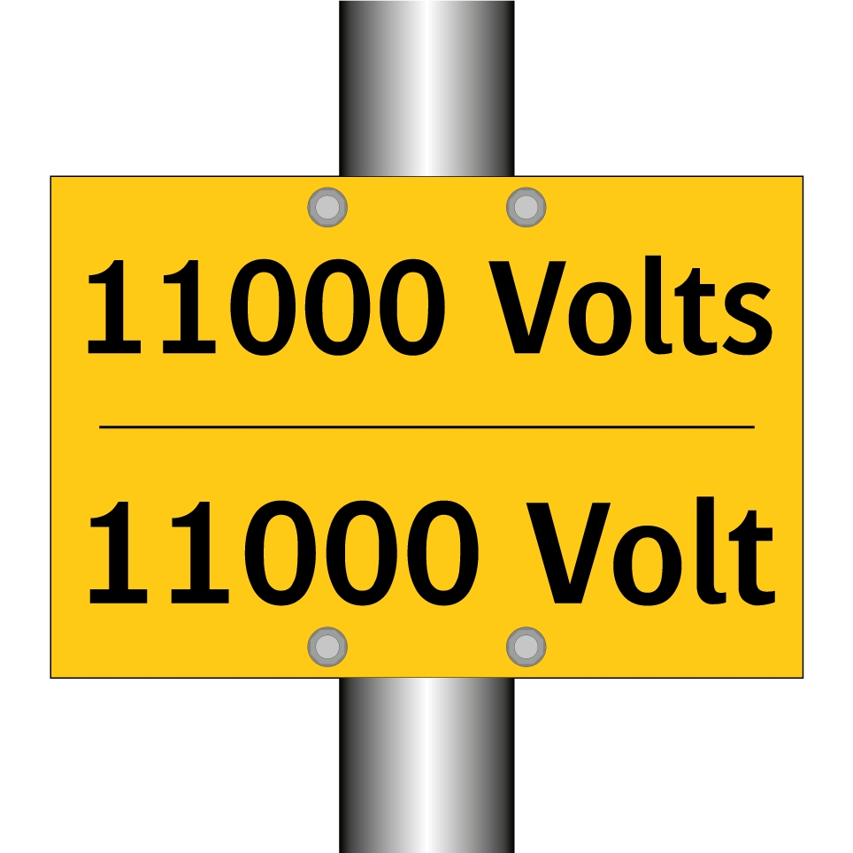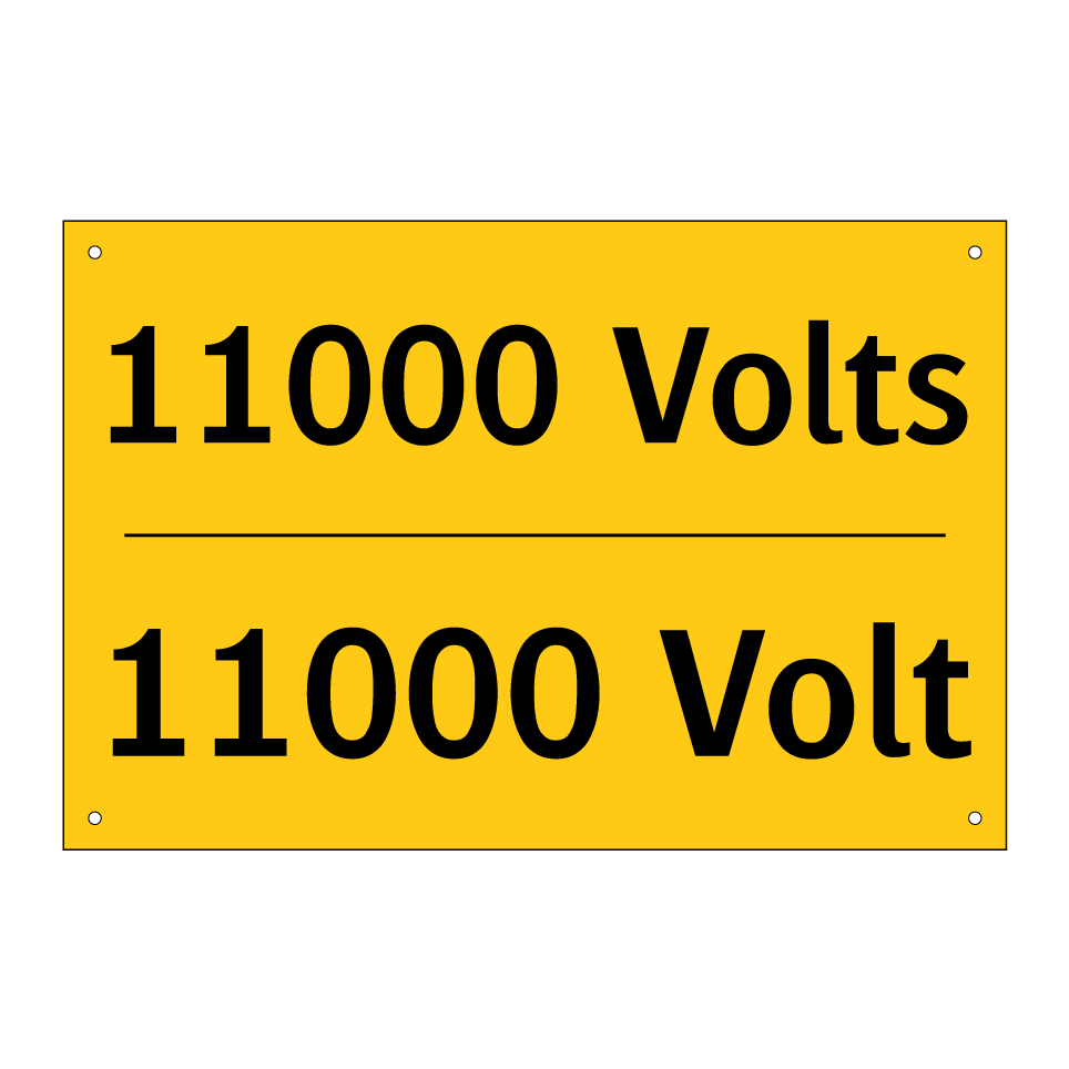 Panneau d'avertissement bilingue avec texte en français : "11000 Volts", et en anglais : "11000 Volt"