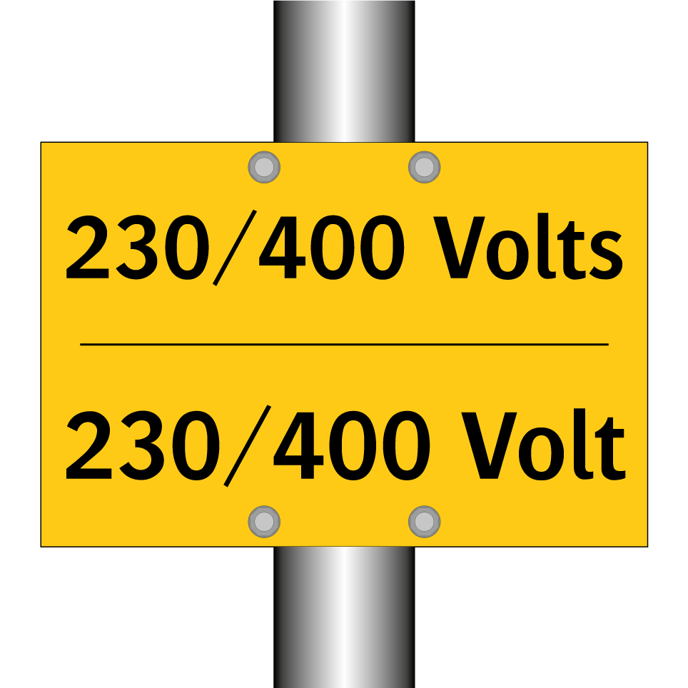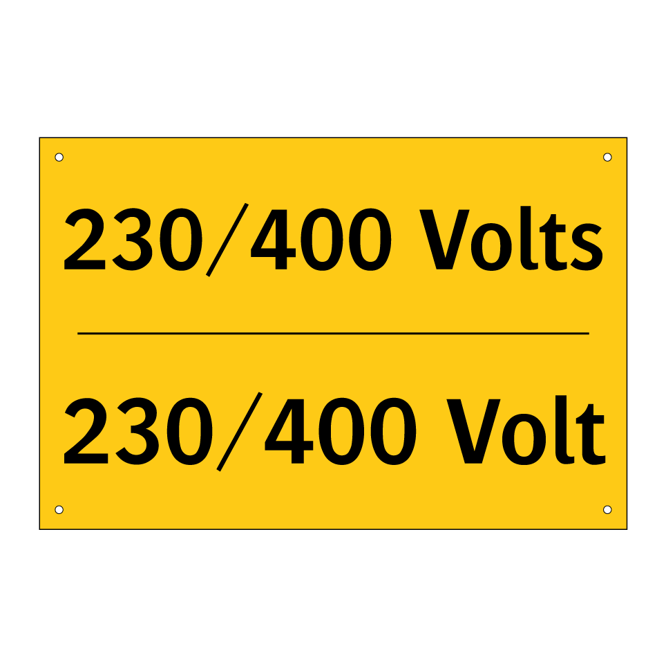 Panneau d'avertissement bilingue avec texte en français : "230/400 Volts", et en anglais : "230/400 Volt"