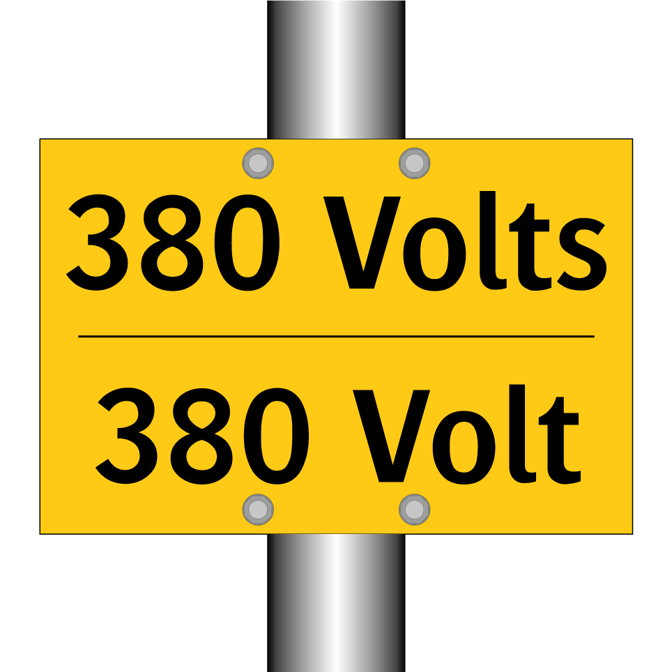 Panneau d'avertissement bilingue avec texte en français : "380 Volts", et en anglais : "380 Volt"