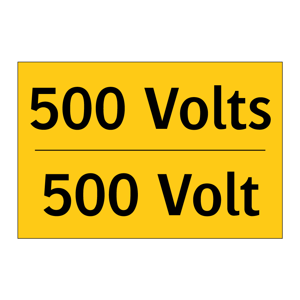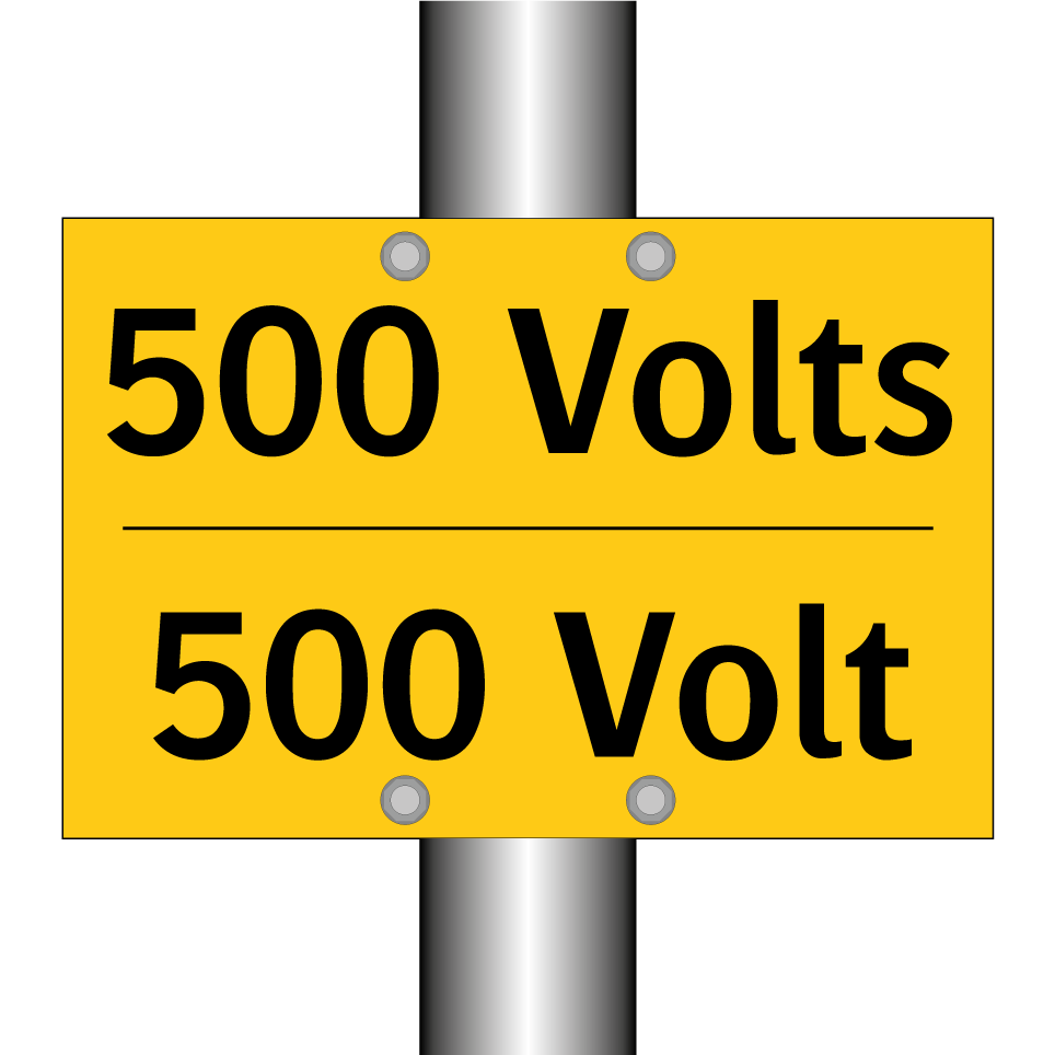 Panneau d'avertissement bilingue avec texte en français : "500 Volts", et en anglais : "500 Volt"