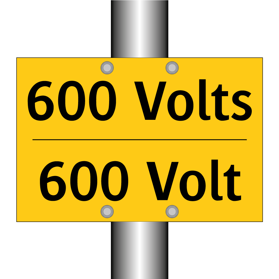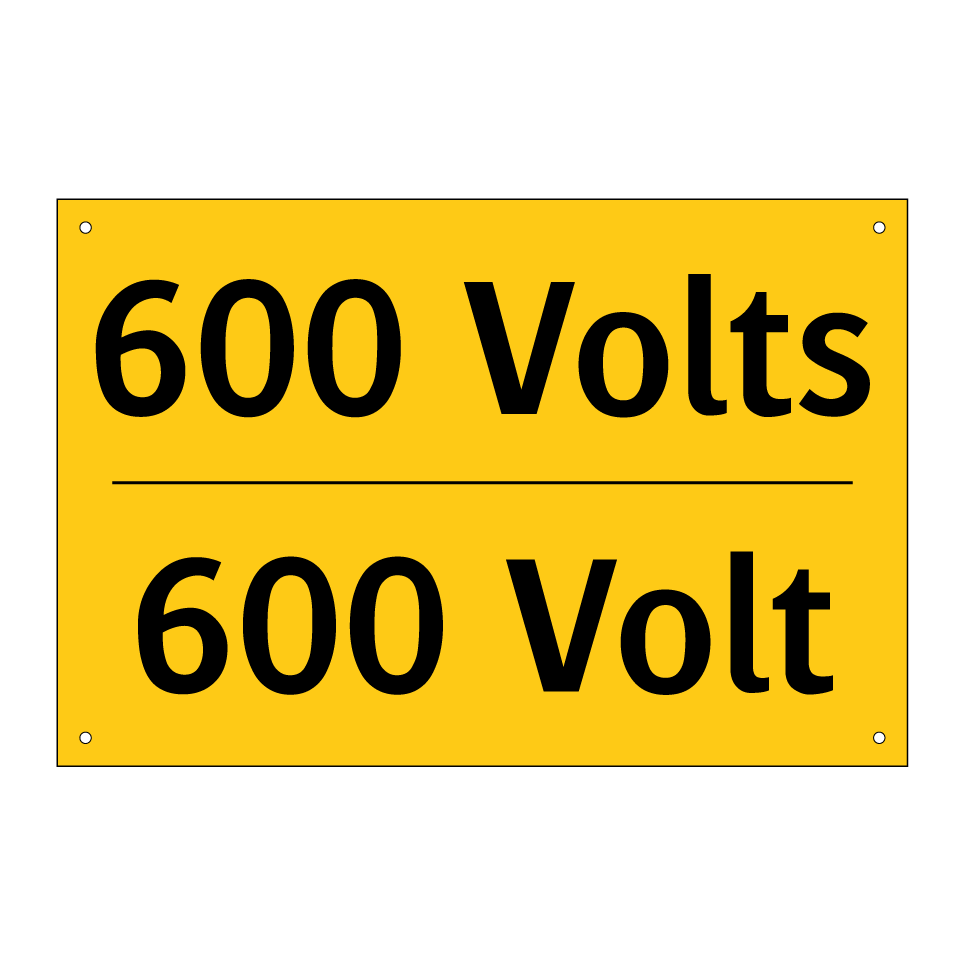 Panneau d'avertissement bilingue avec texte en français : "600 Volts", et en anglais : "600 Volt"