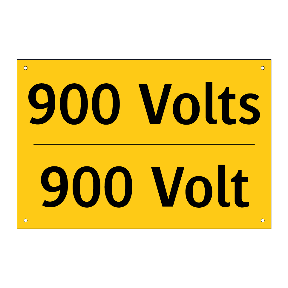 Panneau d'avertissement bilingue avec texte en français : "900 Volts", et en anglais : "900 Volt"