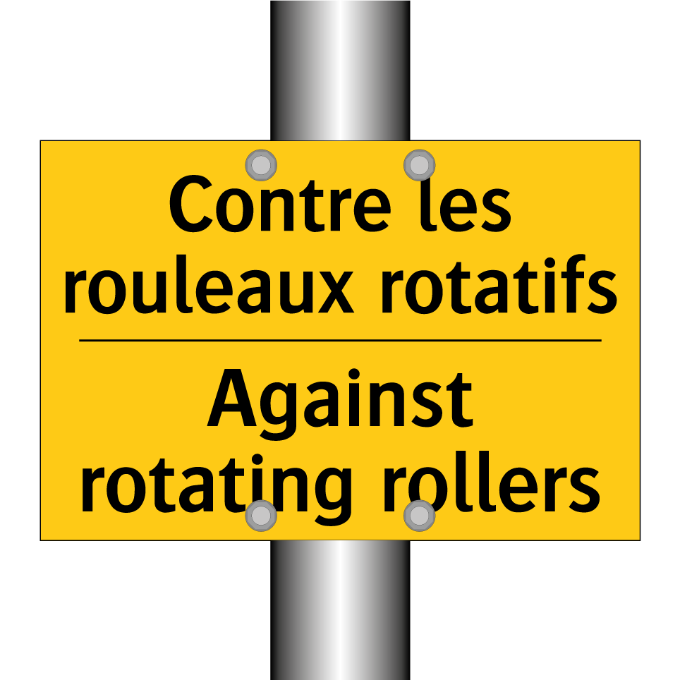 Panneau d'avertissement bilingue avec texte en français : "Contre les rouleaux rotatifs", et en anglais : "Against rotating rollers"