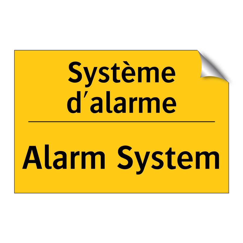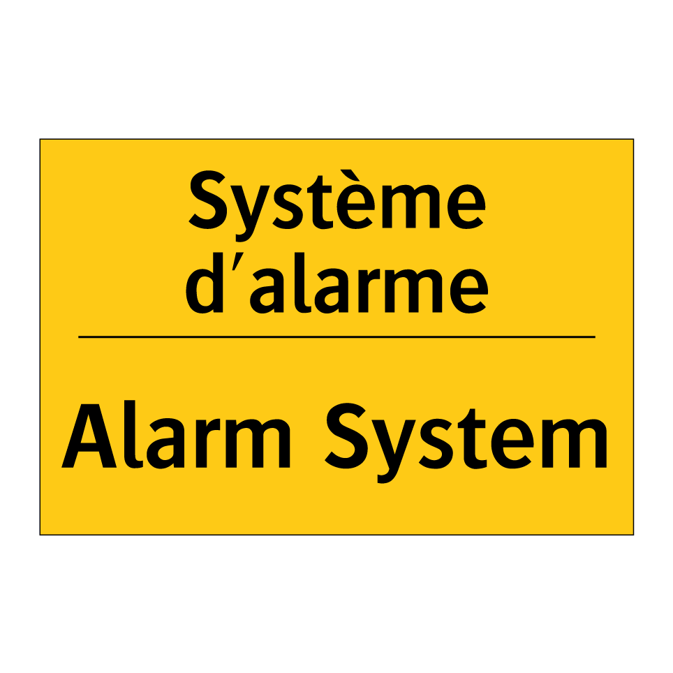 Panneau d'avertissement bilingue avec texte en français : "Système d'alarme", et en anglais : "Alarm System"