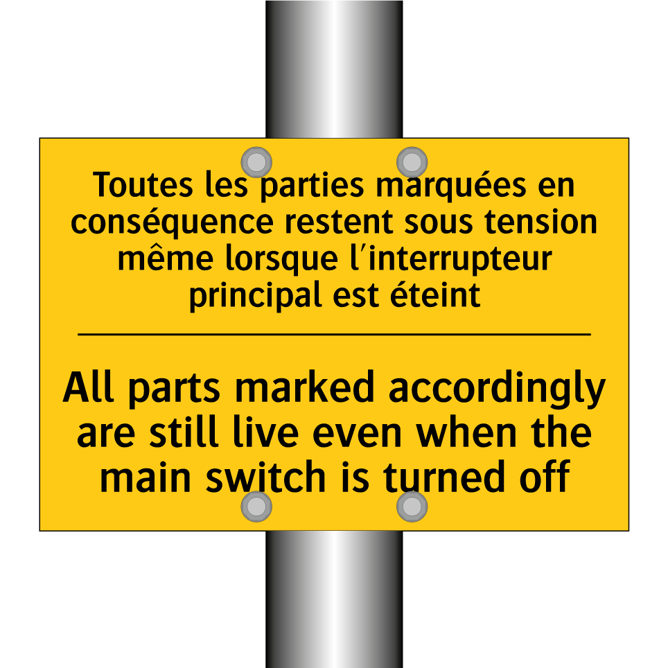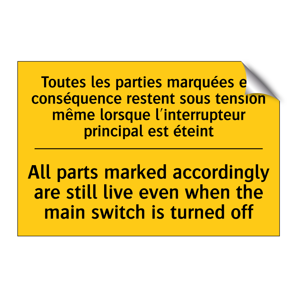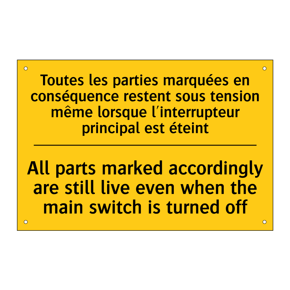 Panneau d'avertissement bilingue avec texte en français : "Toutes les parties marquées en conséquence restent sous tension même lorsque l'interrupteur principal est éteint", et en anglais : "All parts marked accordingly are still live even when the main switch is turned off"