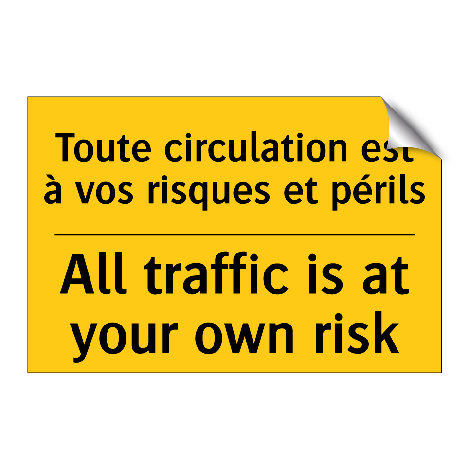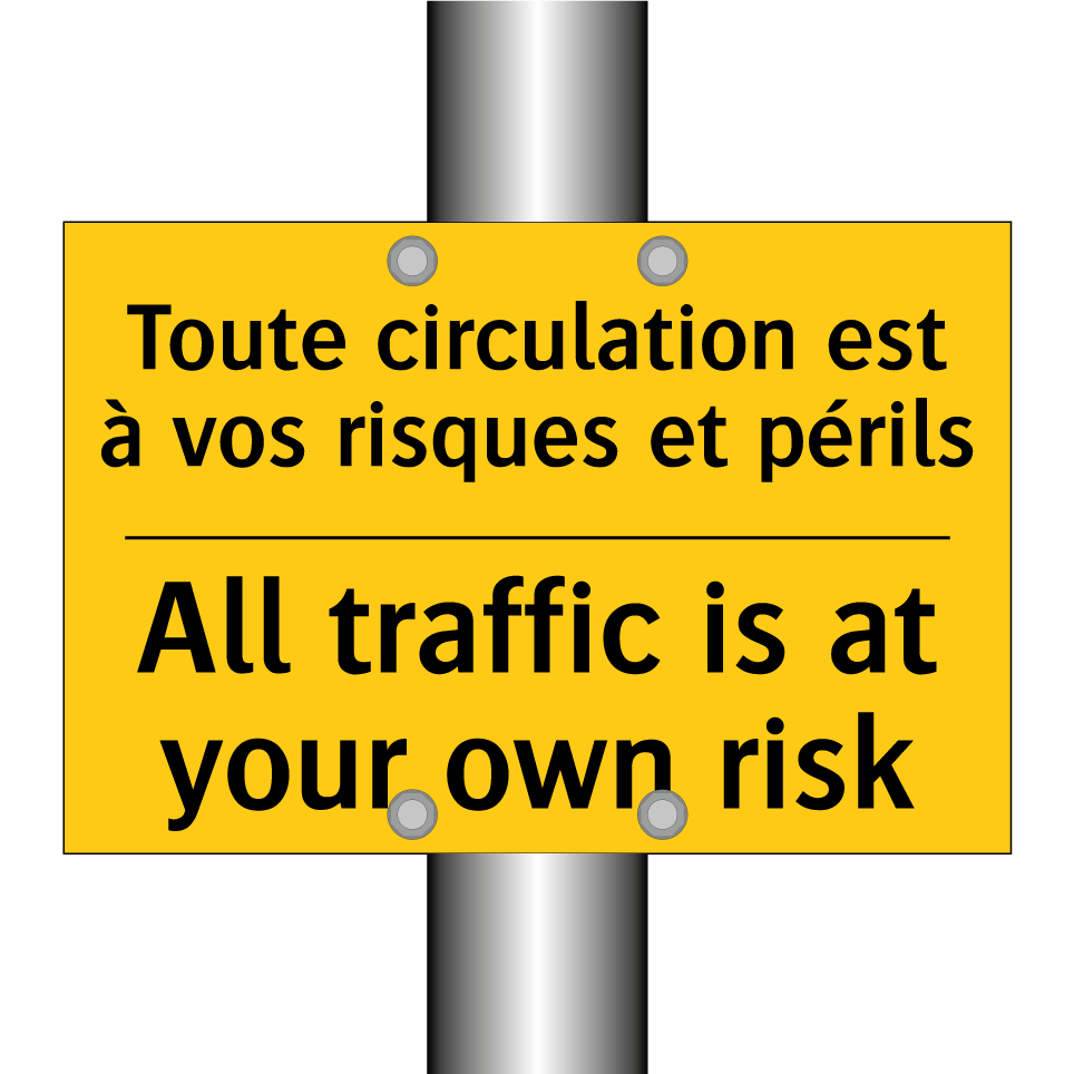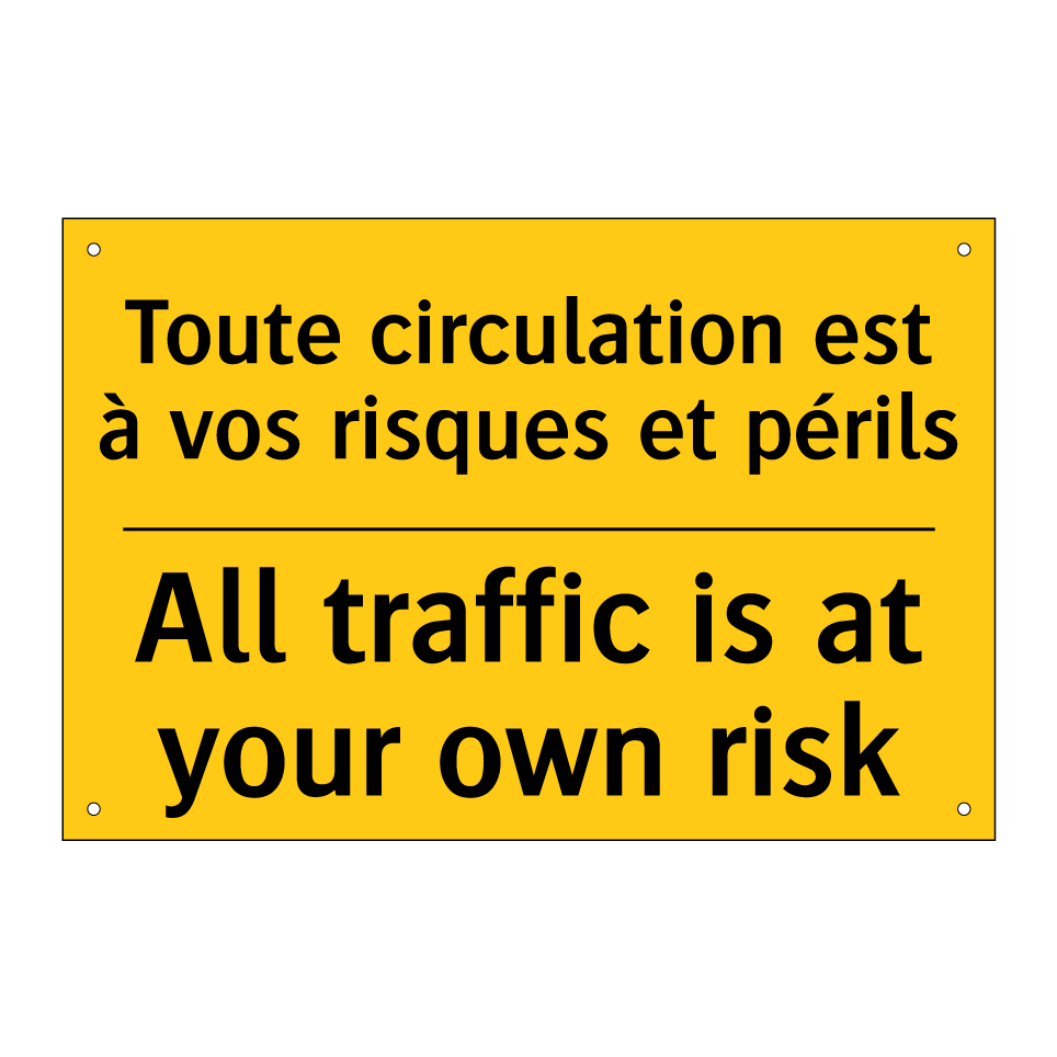 Panneau d'avertissement bilingue avec texte en français : "Toute circulation est à vos risques et périls", et en anglais : "All traffic is at your own risk"