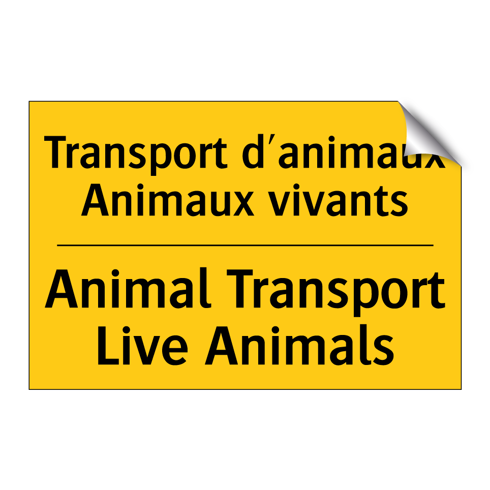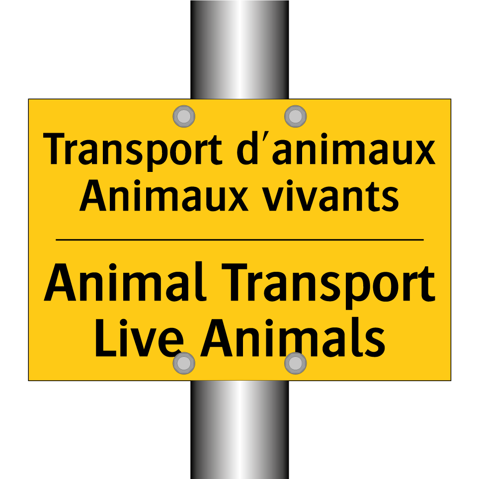 Panneau d'avertissement bilingue avec texte en français : "Transport d'animaux Animaux vivants", et en anglais : "Animal Transport Live Animals"