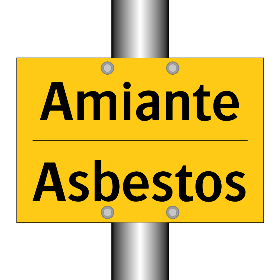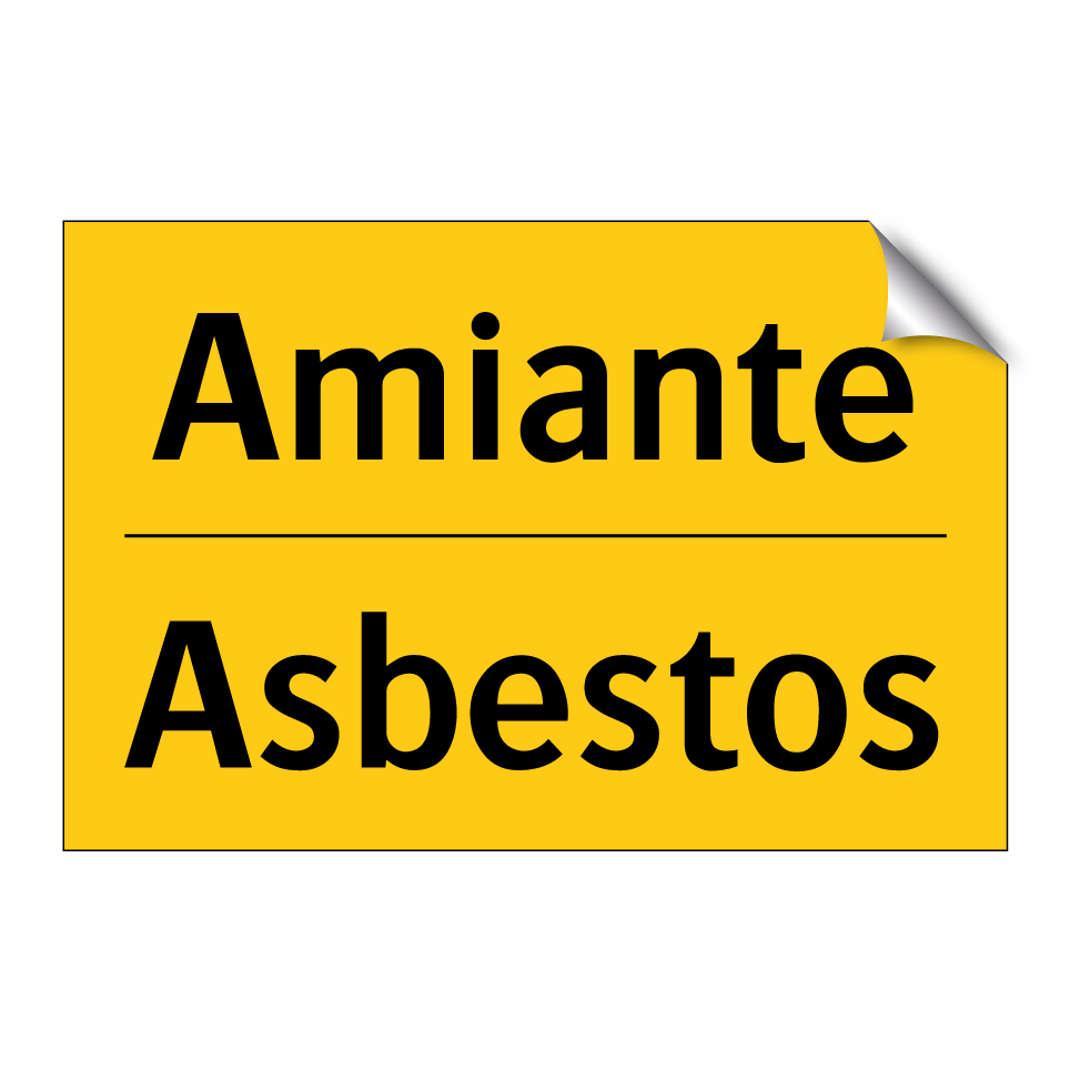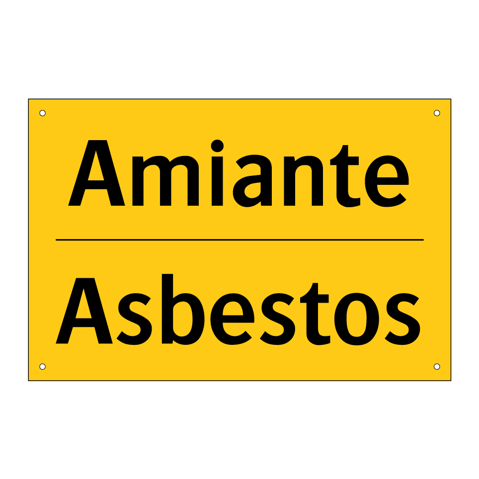 Panneau d'avertissement bilingue avec texte en français : "Amiante", et en anglais : "Asbestos"