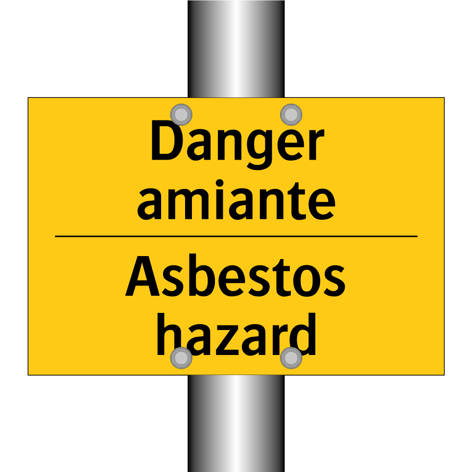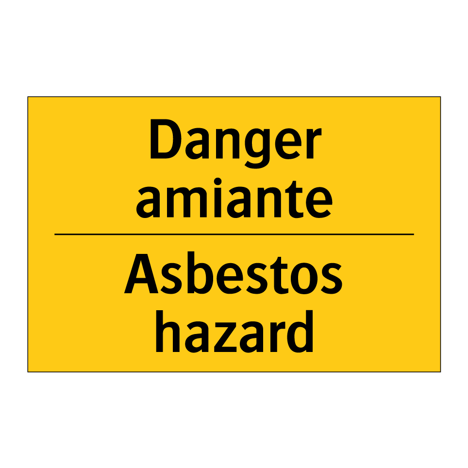 Panneau d'avertissement bilingue avec texte en français : "Danger amiante", et en anglais : "Asbestos hazard"