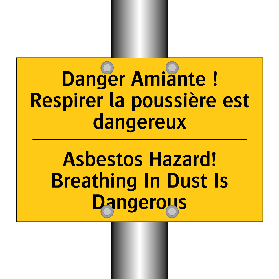 Panneau d'avertissement bilingue avec texte en français : "Danger Amiante ! Respirer la poussière est dangereux", et en anglais : "Asbestos Hazard! Breathing In Dust Is Dangerous"