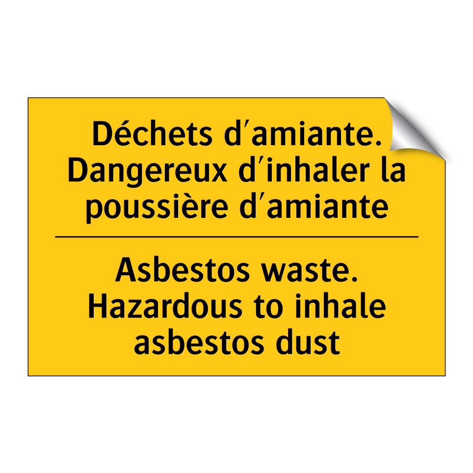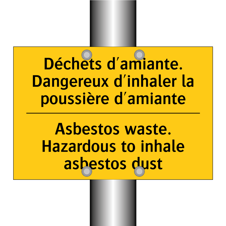 Panneau d'avertissement bilingue avec texte en français : "Déchets d'amiante. Dangereux d'inhaler la poussière d'amiante", et en anglais : "Asbestos waste. Hazardous to inhale asbestos dust"