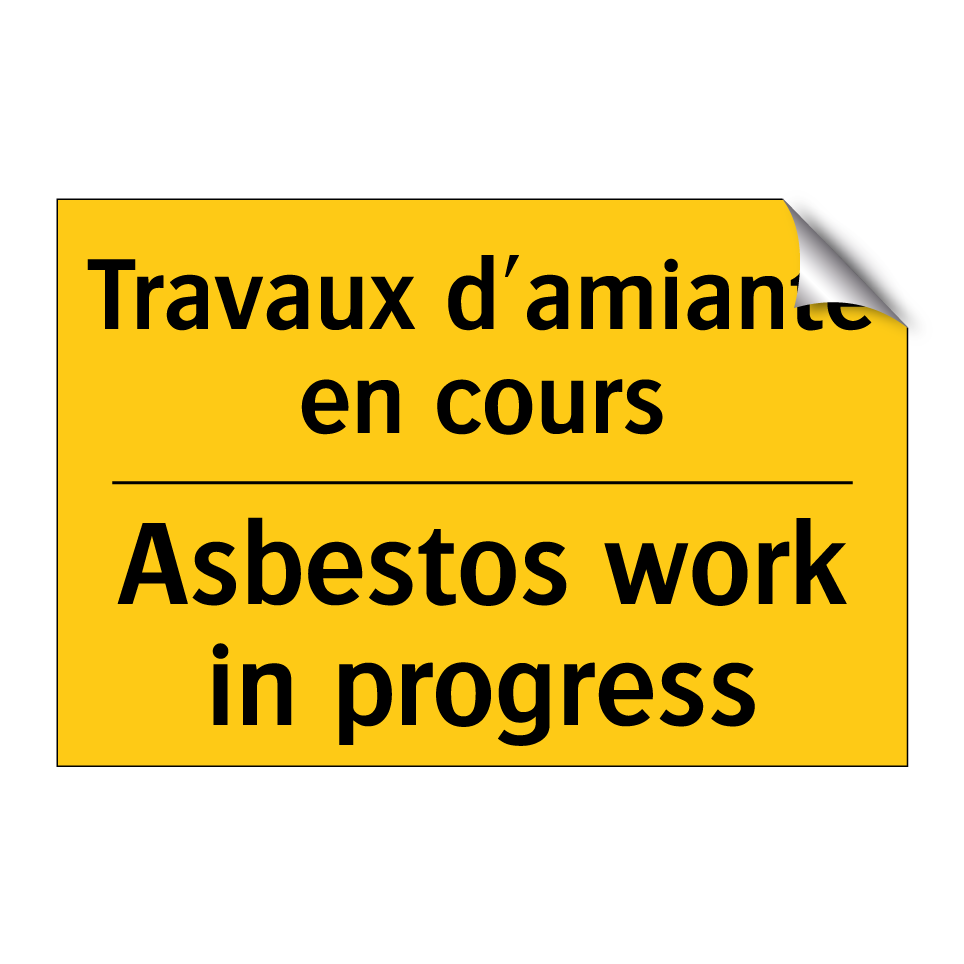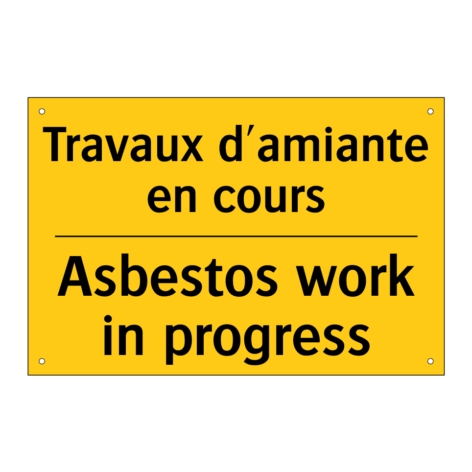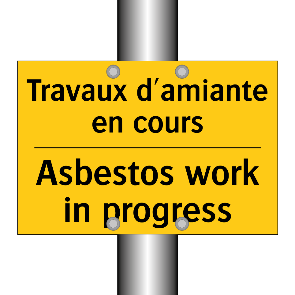 Panneau d'avertissement bilingue avec texte en français : "Travaux d'amiante en cours", et en anglais : "Asbestos work in progress"