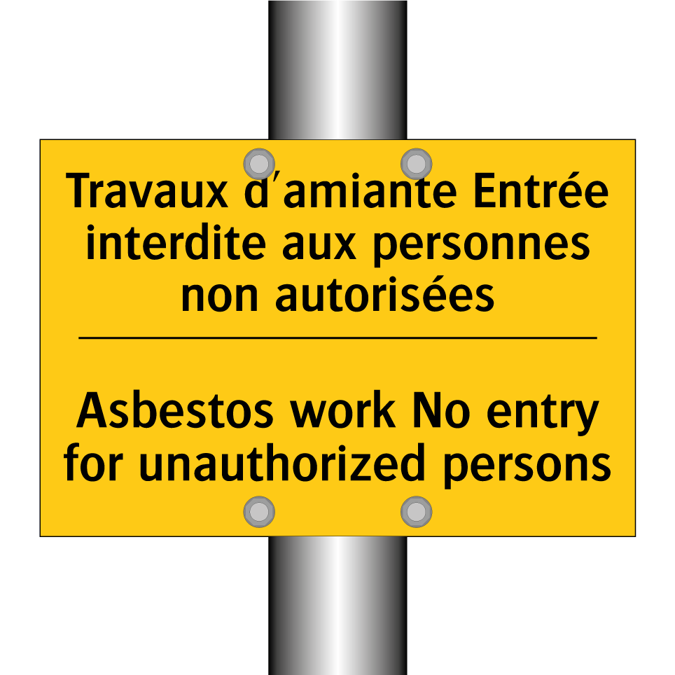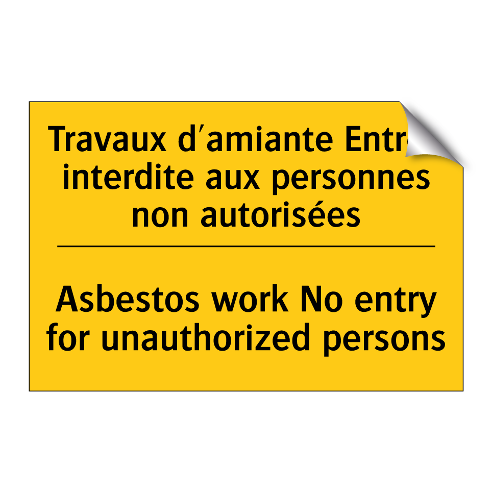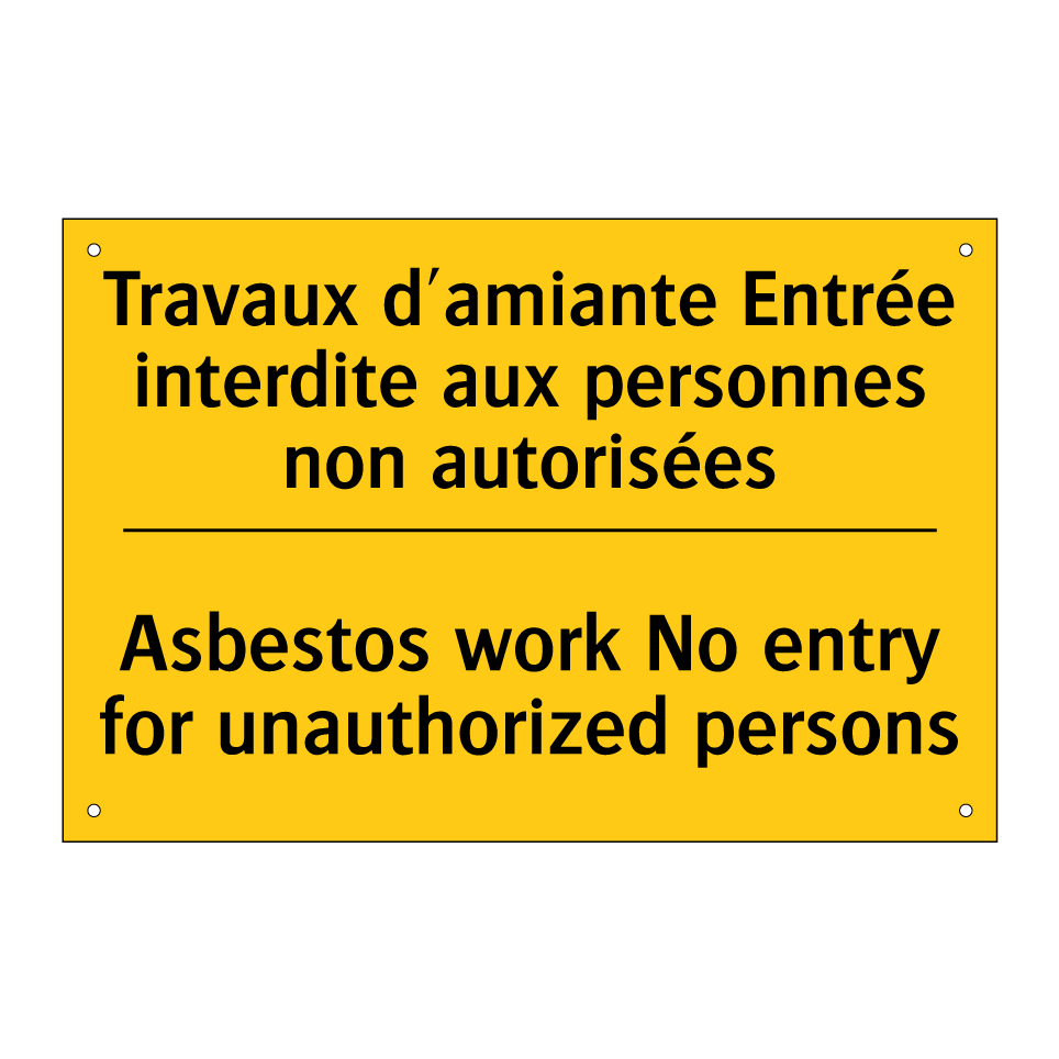 Panneau d'avertissement bilingue avec texte en français : "Travaux d'amiante Entrée interdite aux personnes non autorisées", et en anglais : "Asbestos work No entry for unauthorized persons"