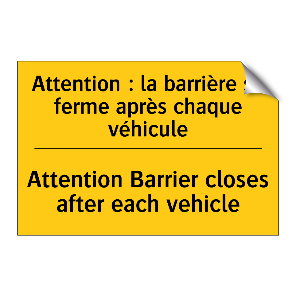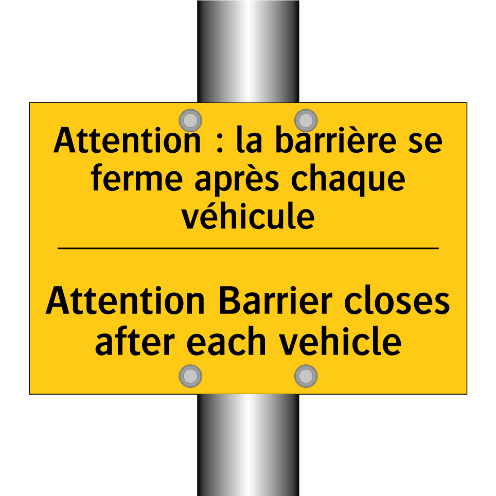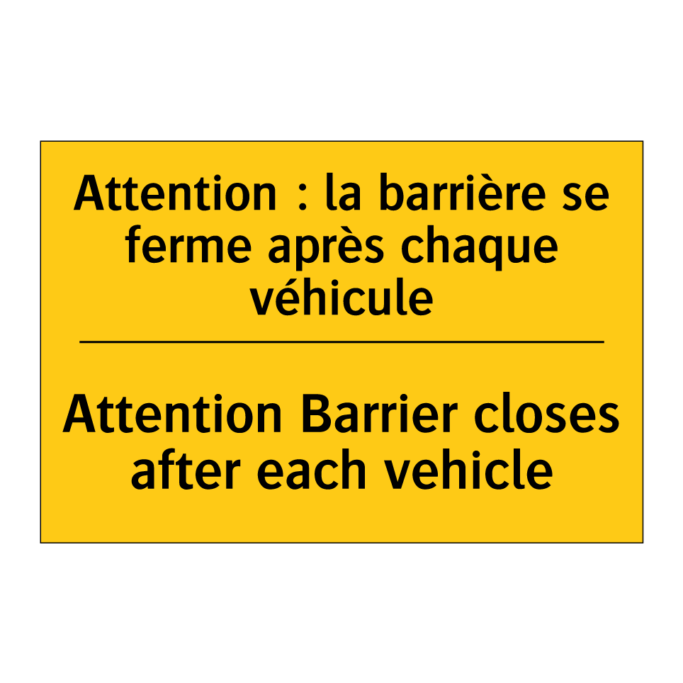 Panneau d'avertissement bilingue avec texte en français : "Attention : la barrière se ferme après chaque véhicule", et en anglais : "Attention Barrier closes after each vehicle"