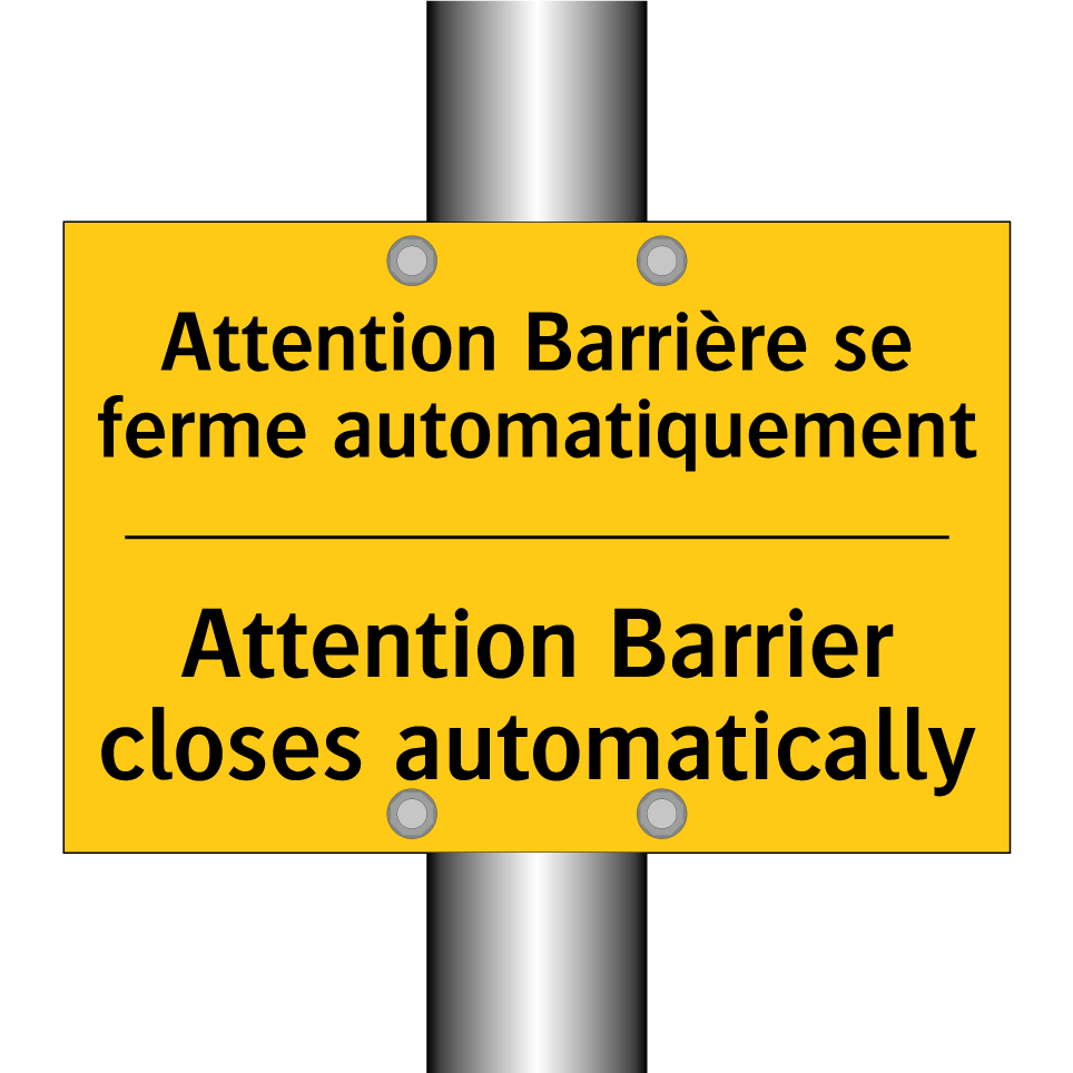 Panneau d'avertissement bilingue avec texte en français : "Attention Barrière se ferme automatiquement", et en anglais : "Attention Barrier closes automatically"