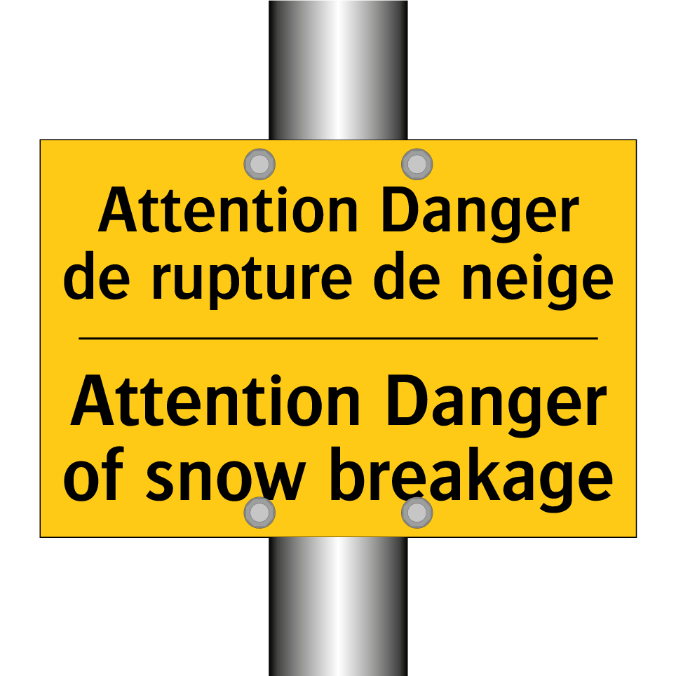 Panneau d'avertissement bilingue avec texte en français : "Attention Danger de rupture de neige", et en anglais : "Attention Danger of snow breakage"