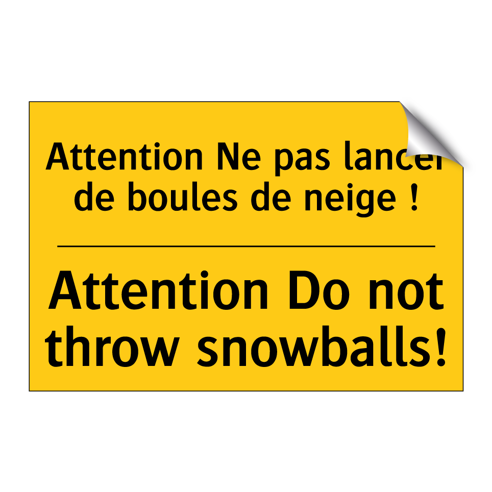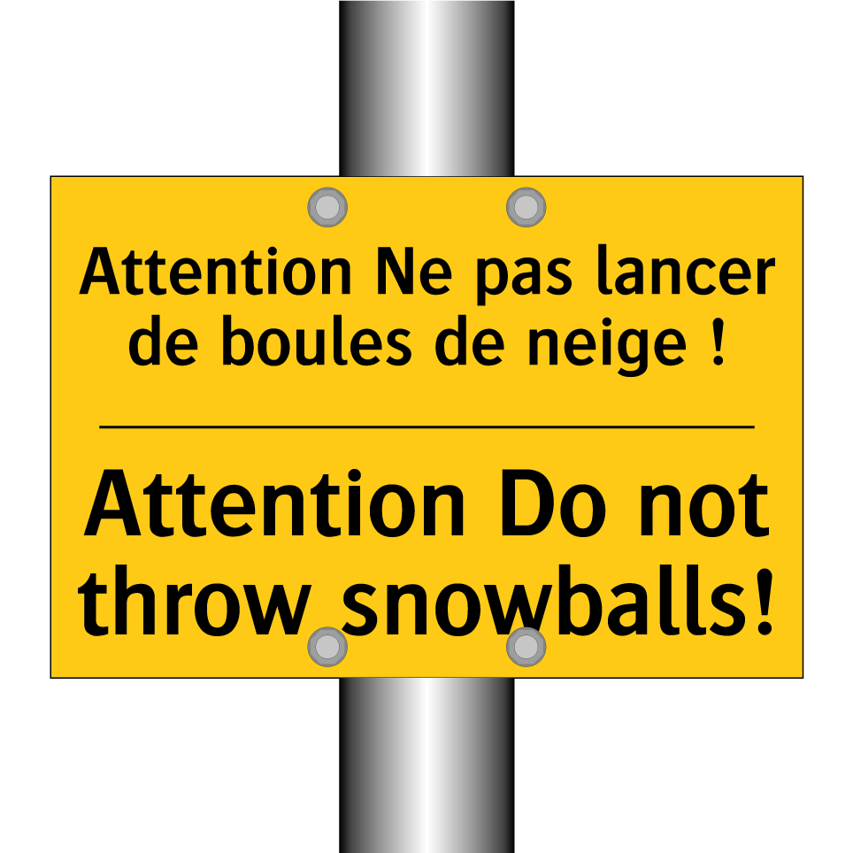 Panneau d'avertissement bilingue avec texte en français : "Attention Ne pas lancer de boules de neige !", et en anglais : "Attention Do not throw snowballs!"