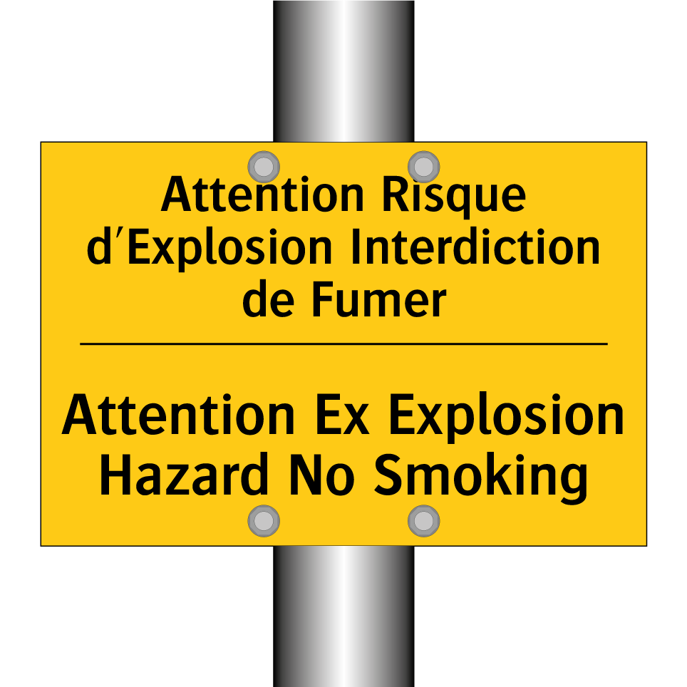 Panneau d'avertissement bilingue avec texte en français : "Attention Risque d'Explosion Interdiction de Fumer", et en anglais : "Attention Ex Explosion Hazard No Smoking"