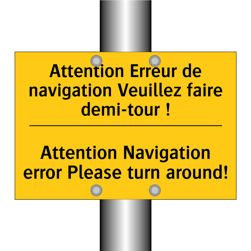 Panneau d'avertissement bilingue avec texte en français : "Attention Erreur de navigation Veuillez faire demi-tour !", et en anglais : "Attention Navigation error Please turn around!"