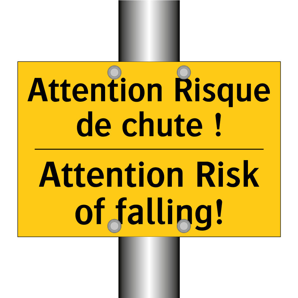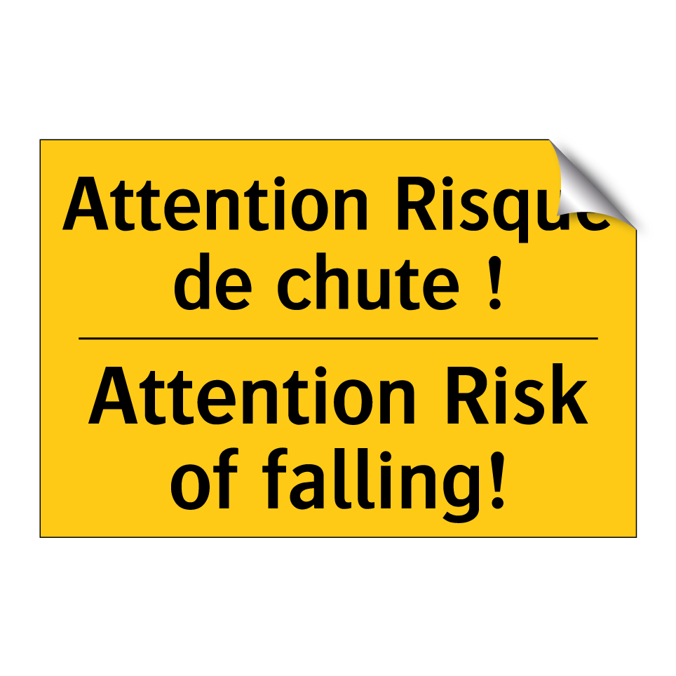 Panneau d'avertissement bilingue avec texte en français : "Attention Risque de chute !", et en anglais : "Attention Risk of falling!"