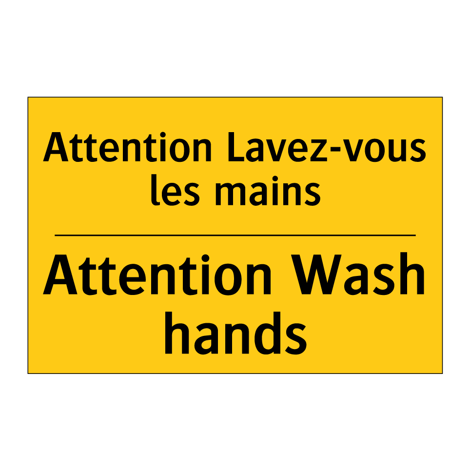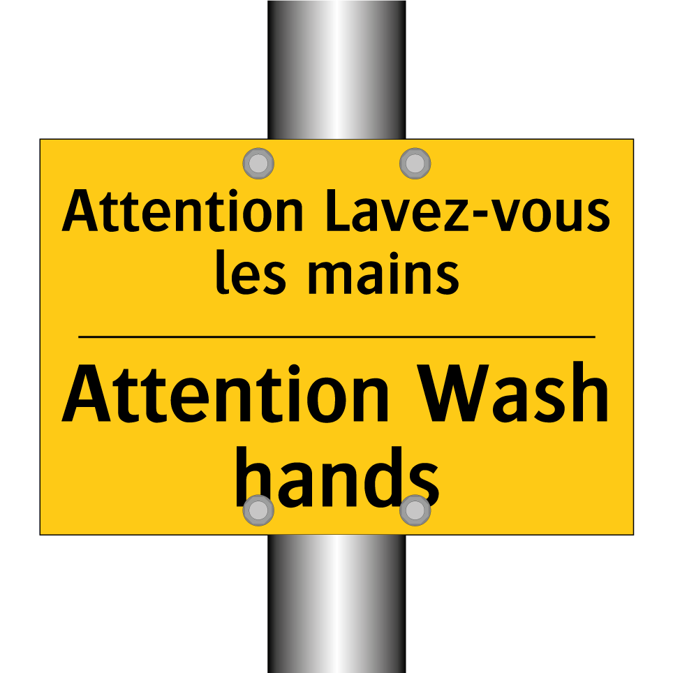 Panneau d'avertissement bilingue avec texte en français : "Attention Lavez-vous les mains", et en anglais : "Attention Wash hands"