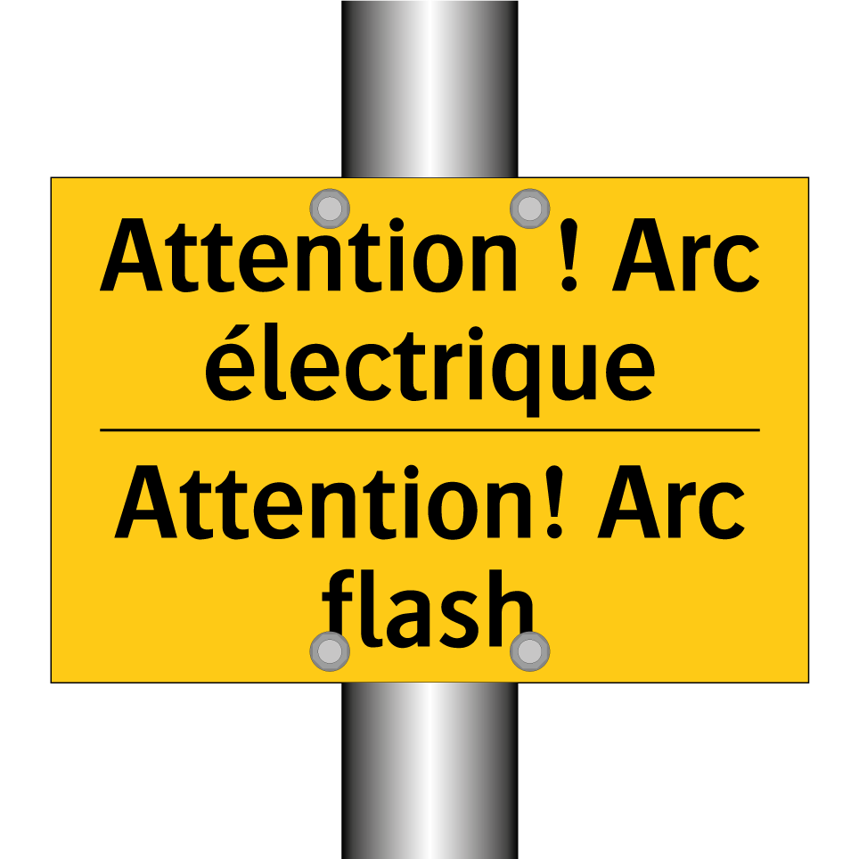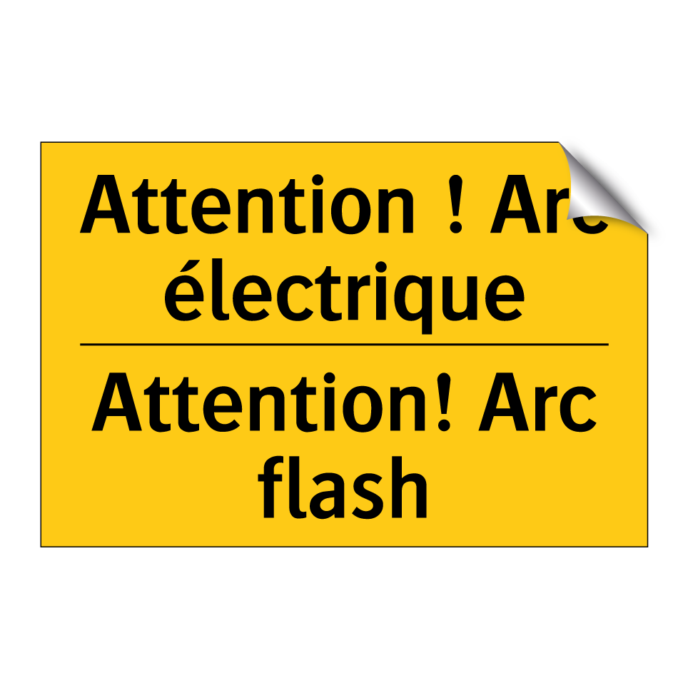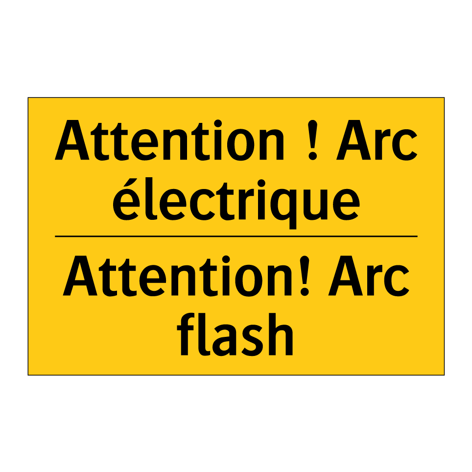 Panneau d'avertissement bilingue avec texte en français : "Attention ! Arc électrique", et en anglais : "Attention! Arc flash"