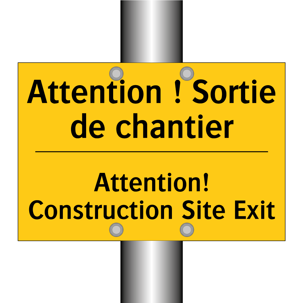 Panneau d'avertissement bilingue avec texte en français : "Attention ! Sortie de chantier", et en anglais : "Attention! Construction Site Exit"