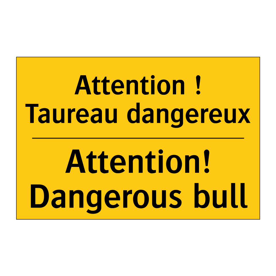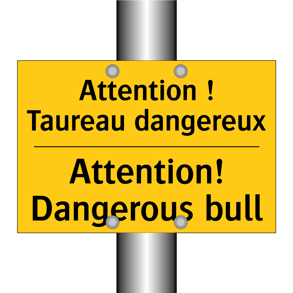Panneau d'avertissement bilingue avec texte en français : "Attention ! Taureau dangereux", et en anglais : "Attention! Dangerous bull"
