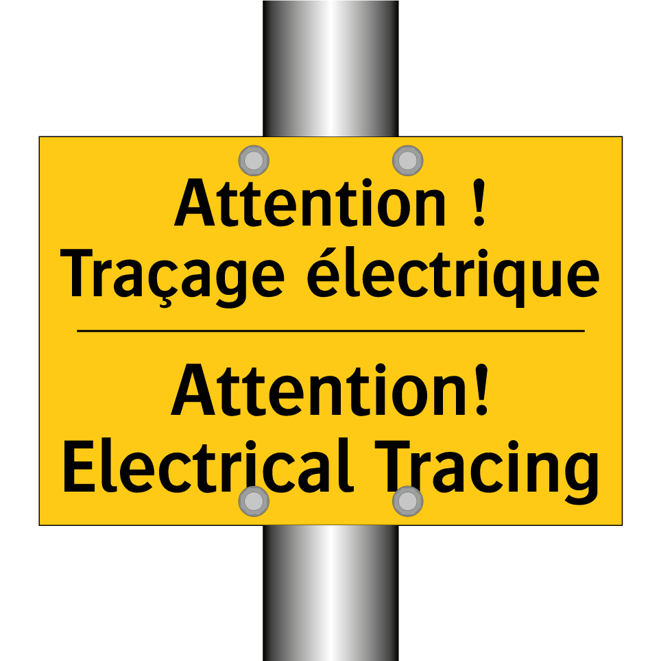 Panneau d'avertissement bilingue avec texte en français : "Attention ! Traçage électrique", et en anglais : "Attention! Electrical Tracing"