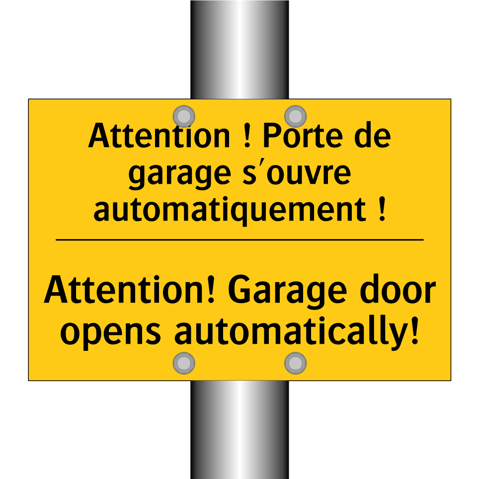 Panneau d'avertissement bilingue avec texte en français : "Attention ! Porte de garage s'ouvre automatiquement !", et en anglais : "Attention! Garage door opens automatically!"