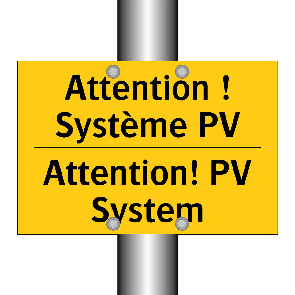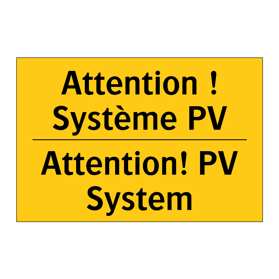 Panneau d'avertissement bilingue avec texte en français : "Attention ! Système PV", et en anglais : "Attention! PV System"