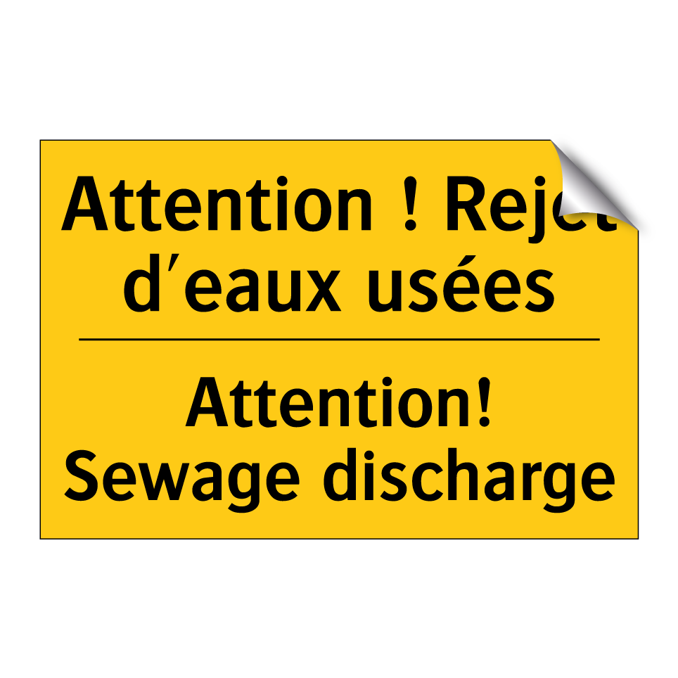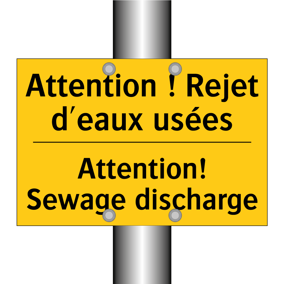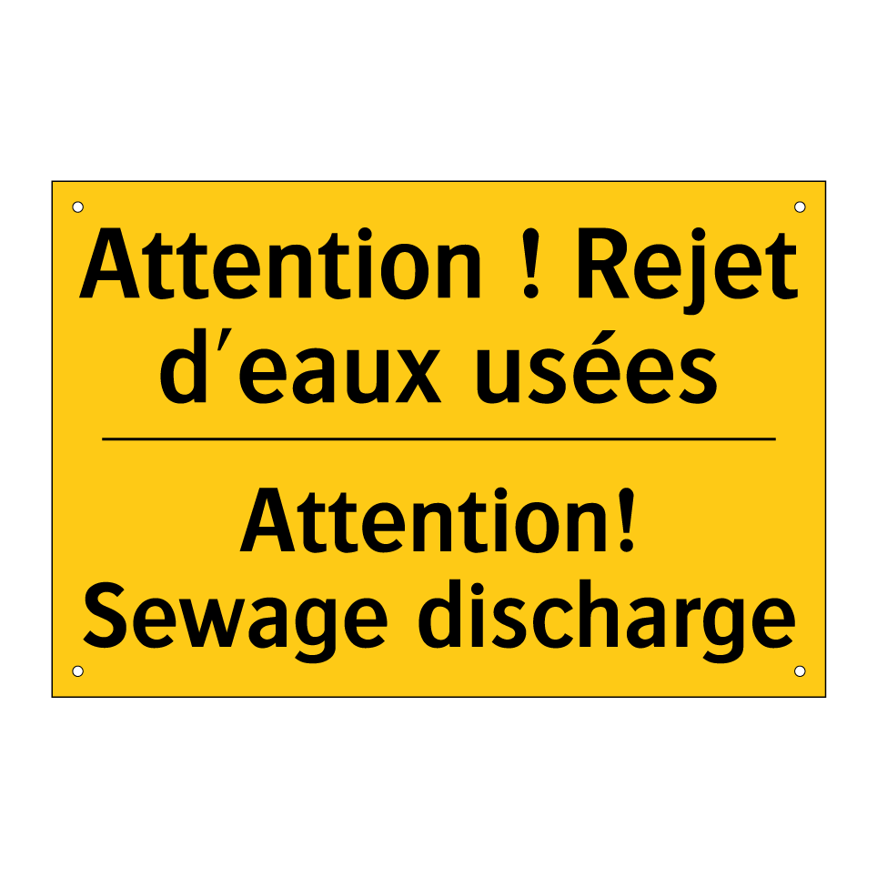 Panneau d'avertissement bilingue avec texte en français : "Attention ! Rejet d'eaux usées", et en anglais : "Attention! Sewage discharge"