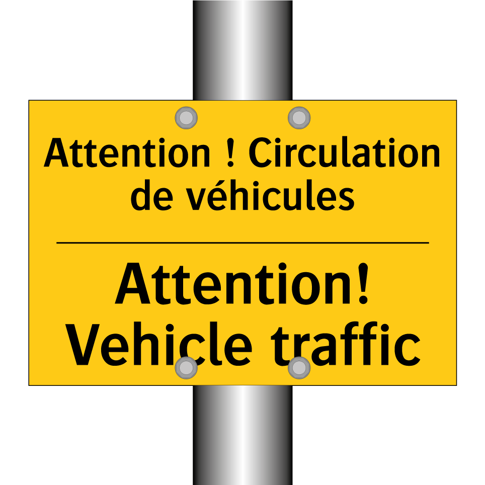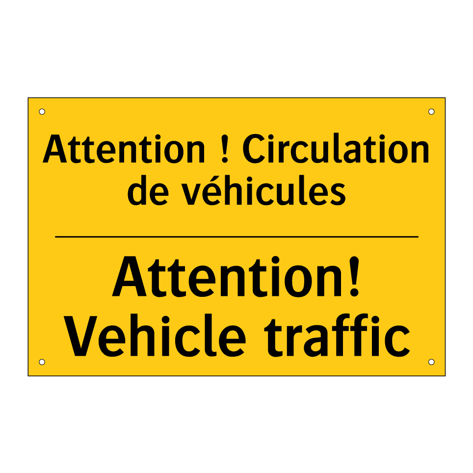 Panneau d'avertissement bilingue avec texte en français : "Attention ! Circulation de véhicules", et en anglais : "Attention! Vehicle traffic"