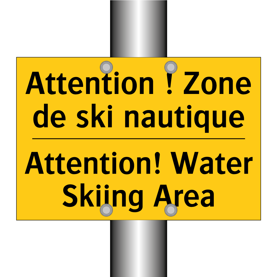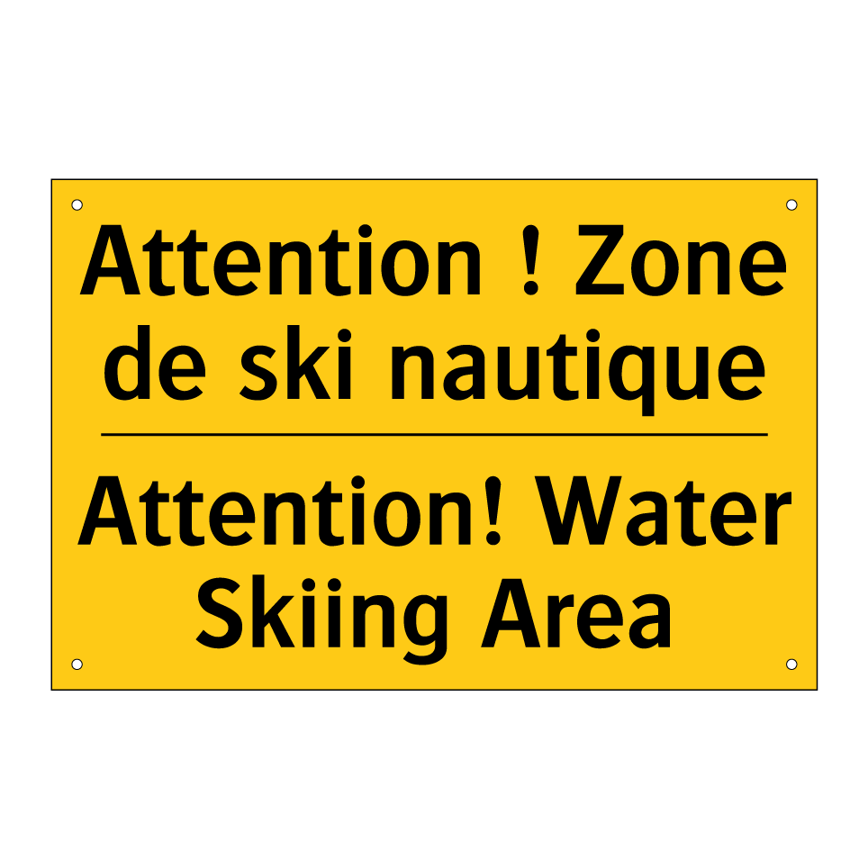 Panneau d'avertissement bilingue avec texte en français : "Attention ! Zone de ski nautique", et en anglais : "Attention! Water Skiing Area"