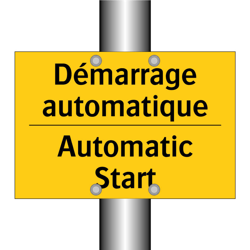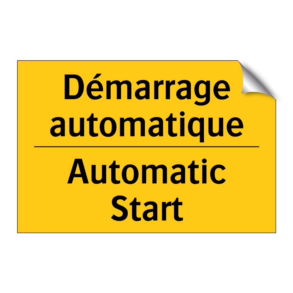 Panneau d'avertissement bilingue avec texte en français : "Démarrage automatique", et en anglais : "Automatic Start"