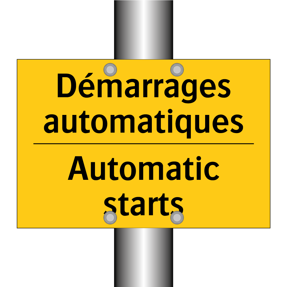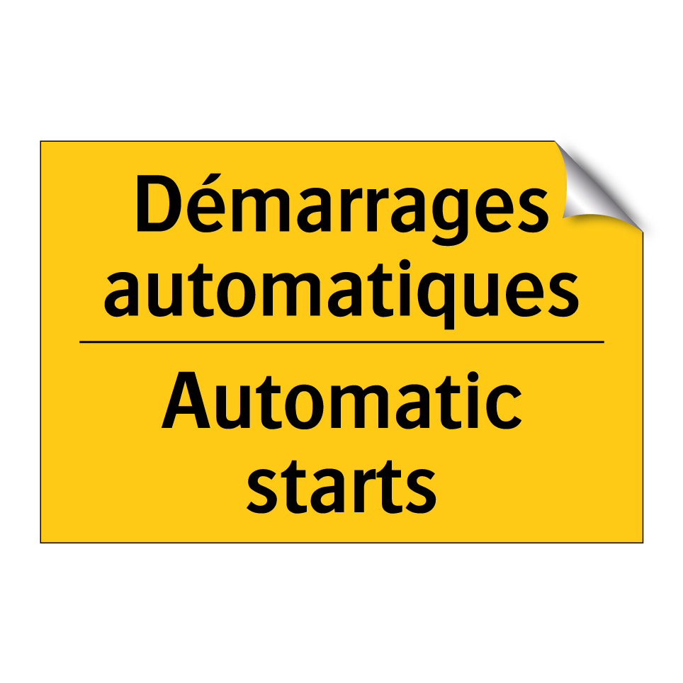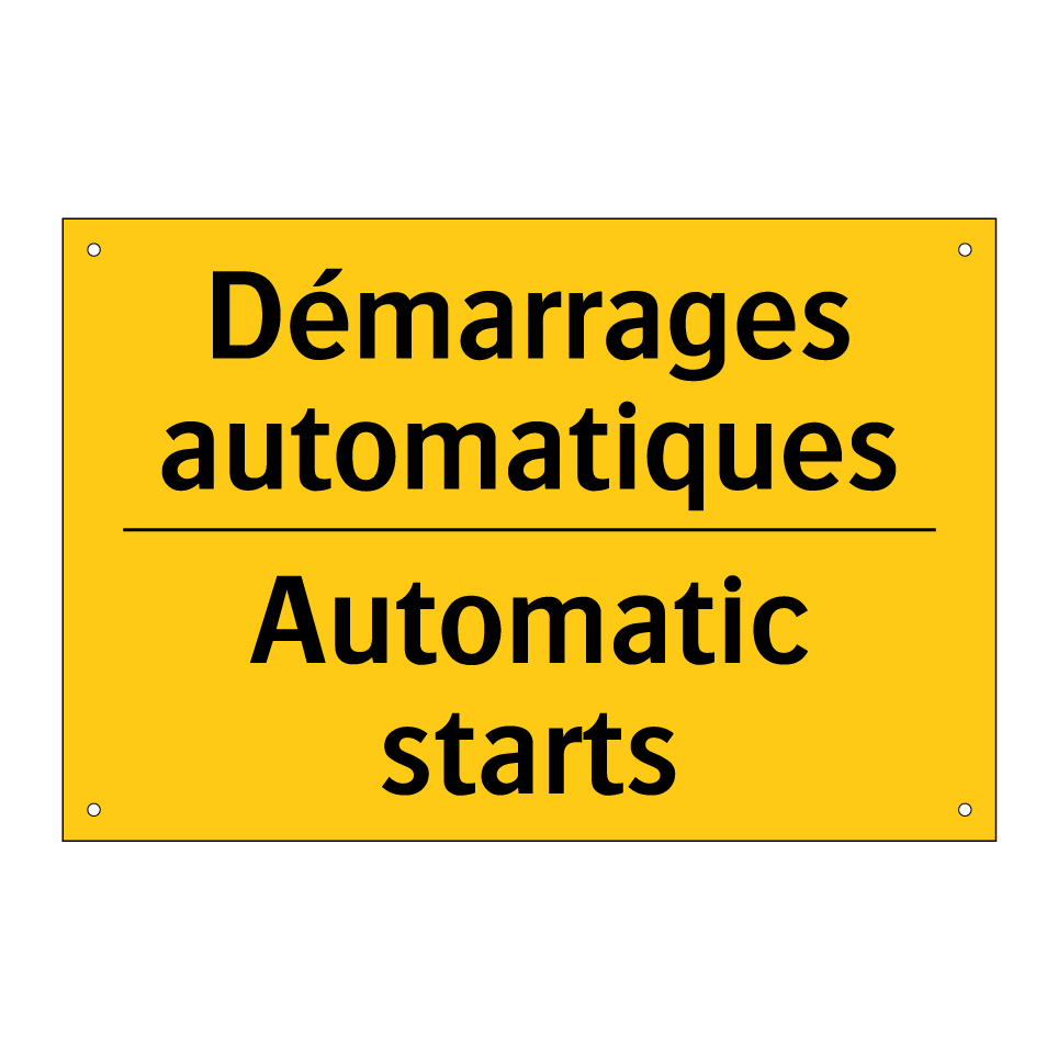 Panneau d'avertissement bilingue avec texte en français : "Démarrages automatiques", et en anglais : "Automatic starts"