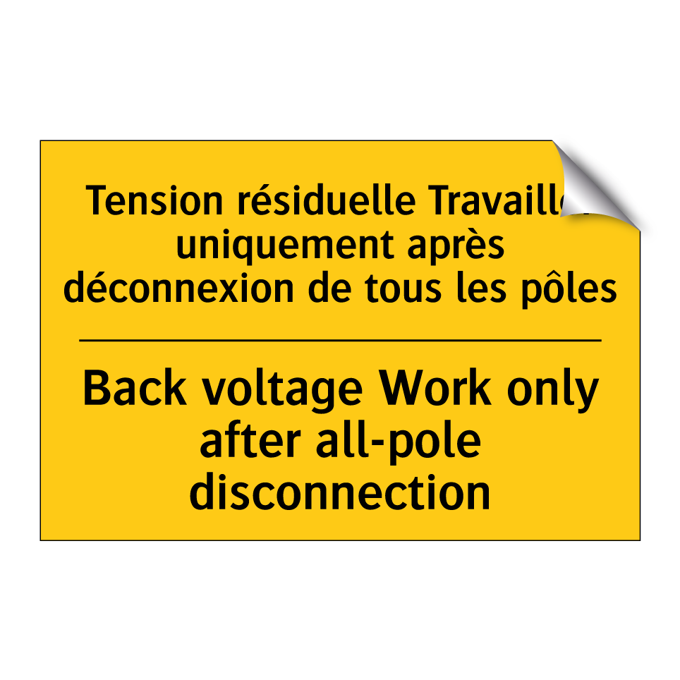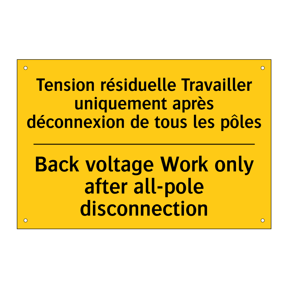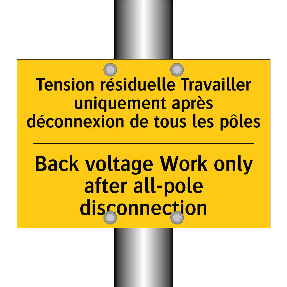 Panneau d'avertissement bilingue avec texte en français : "Tension résiduelle Travailler uniquement après déconnexion de tous les pôles", et en anglais : "Back voltage Work only after all-pole disconnection"