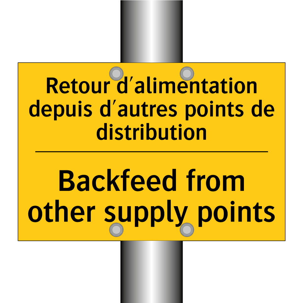 Panneau d'avertissement bilingue avec texte en français : "Retour d'alimentation depuis d'autres points de distribution", et en anglais : "Backfeed from other supply points"