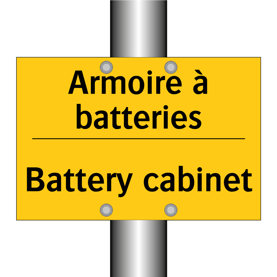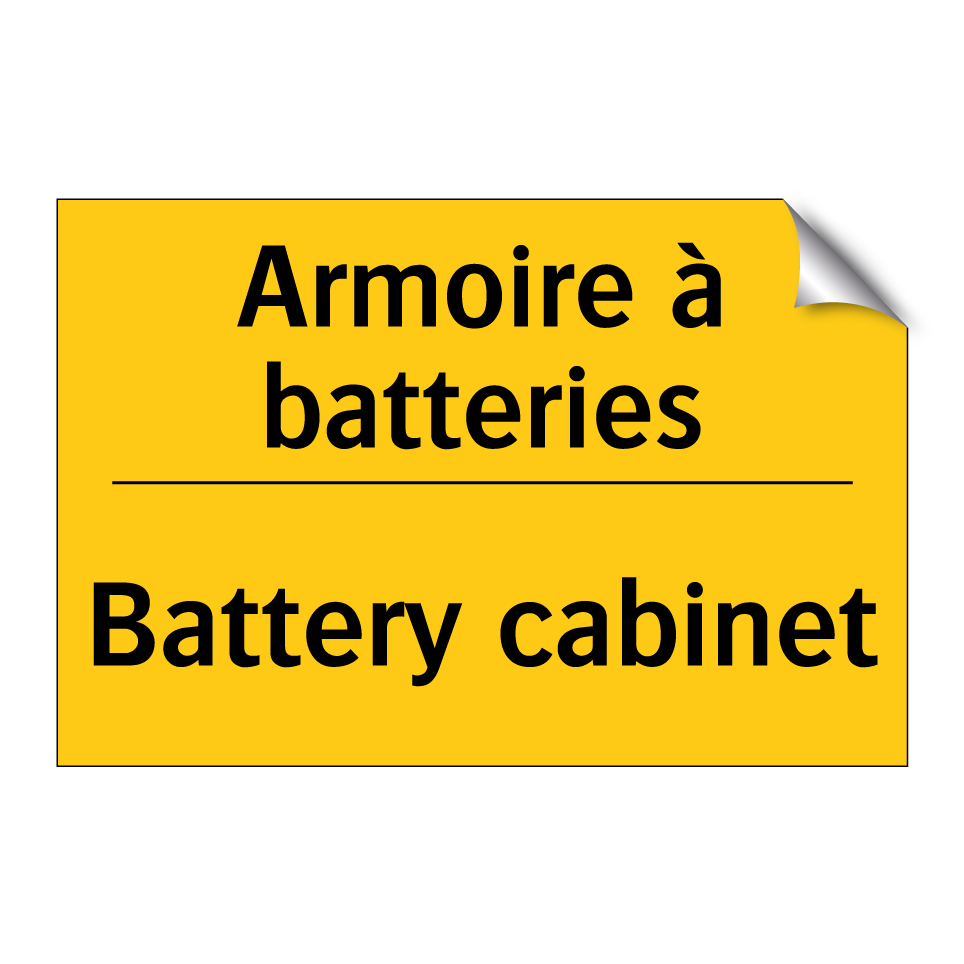 Panneau d'avertissement bilingue avec texte en français : "Armoire à batteries", et en anglais : "Battery cabinet"